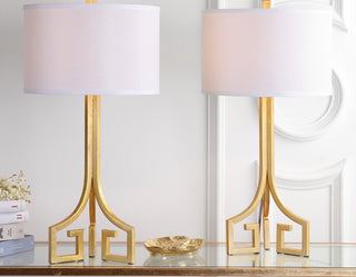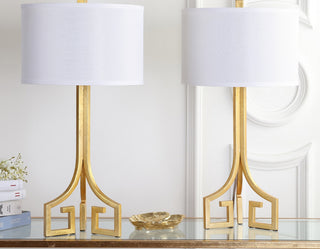 Inspired by the iconic Mykonos resort favored by Hollywood elites, this modern 27 inch table lamp (set of 2) is a classic. A designer favorite, its deluxe Greek key design shines with a lush gold metallic finish, adding glamour and style to any interior.