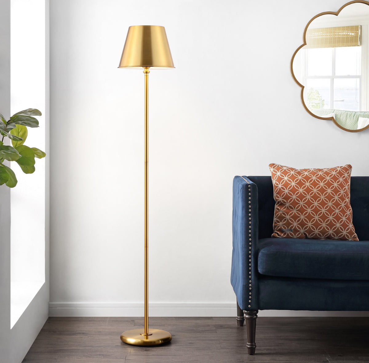 Casting a sublime shine in both contemporary and traditional interiors, this Asher Floor Lamp is absolutely iconic. Asher's rich brass finish embraces every inch of its iron frame and empire shade, making a grand statement in any room.