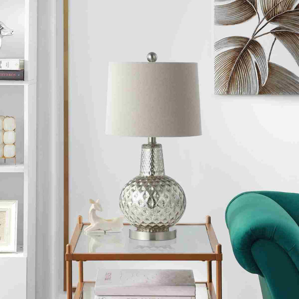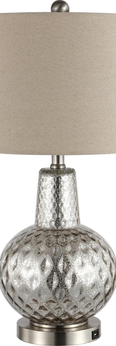 This stunning contemporary table lamp radiates beauty. Designed with mercury glass, its hammered texture instantly upgrades any room with its modern luxurious style. Often used in by designers in pairs to frame a sofa.