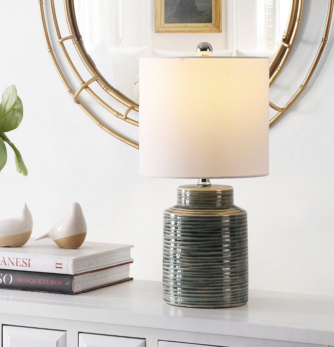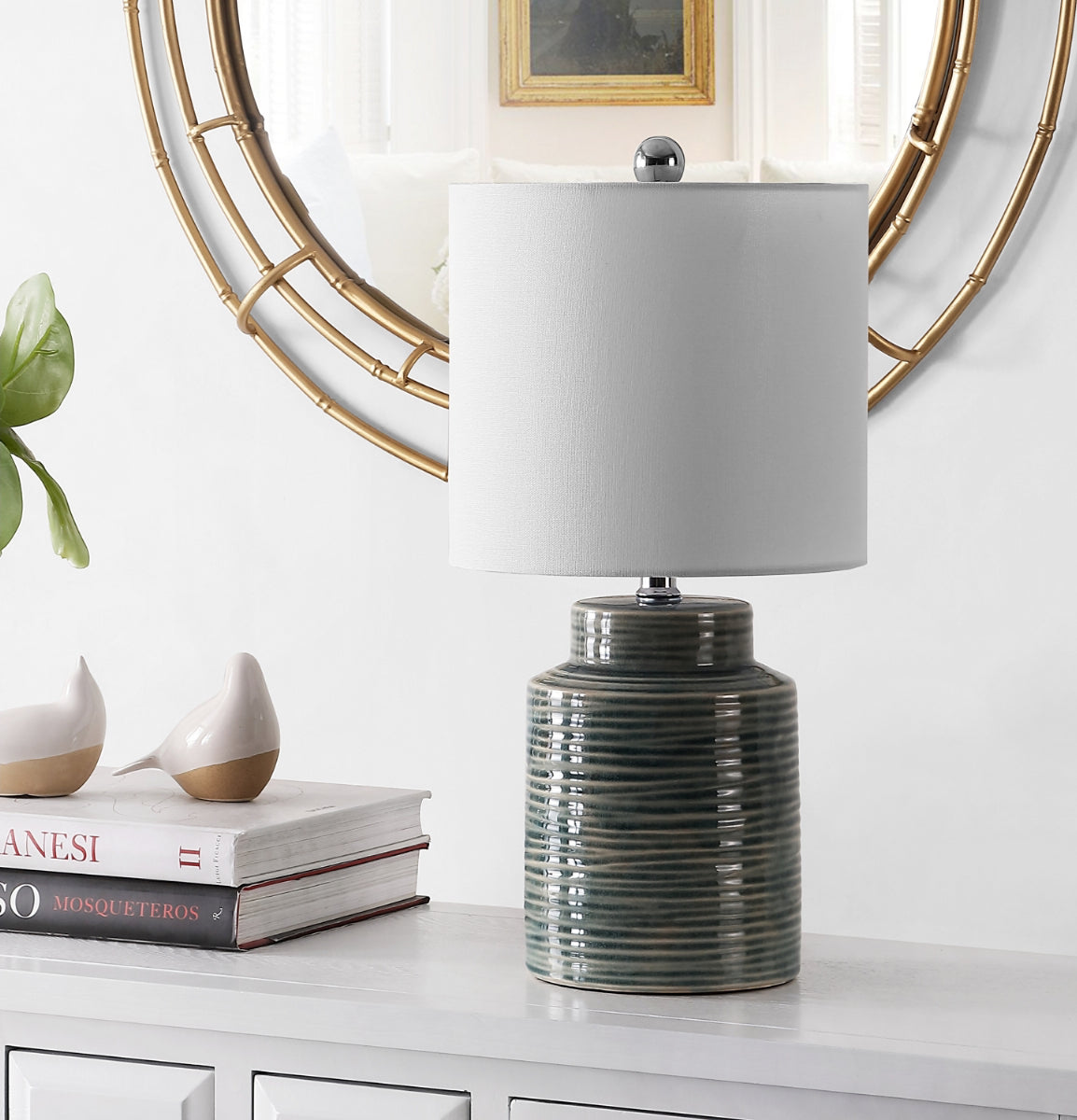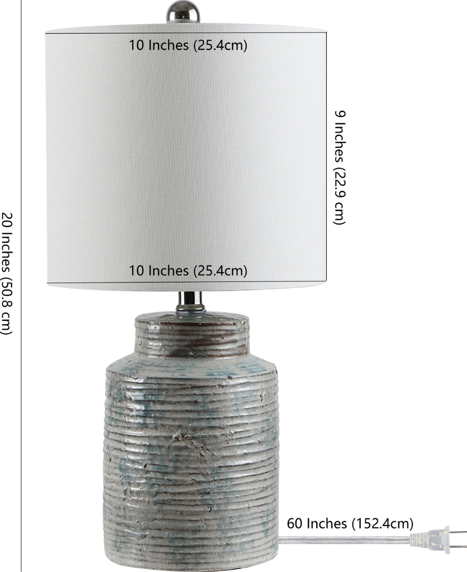 Paying homage to the original pioneers of pottery, this Boris Table Lamp revitalizes classic forms for today's decor. Boris's textured striations hearken back to ancient artistry, while its soft blue green tone and white drum shade make it ideal for any contemporary interior.