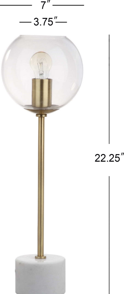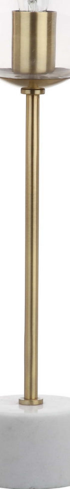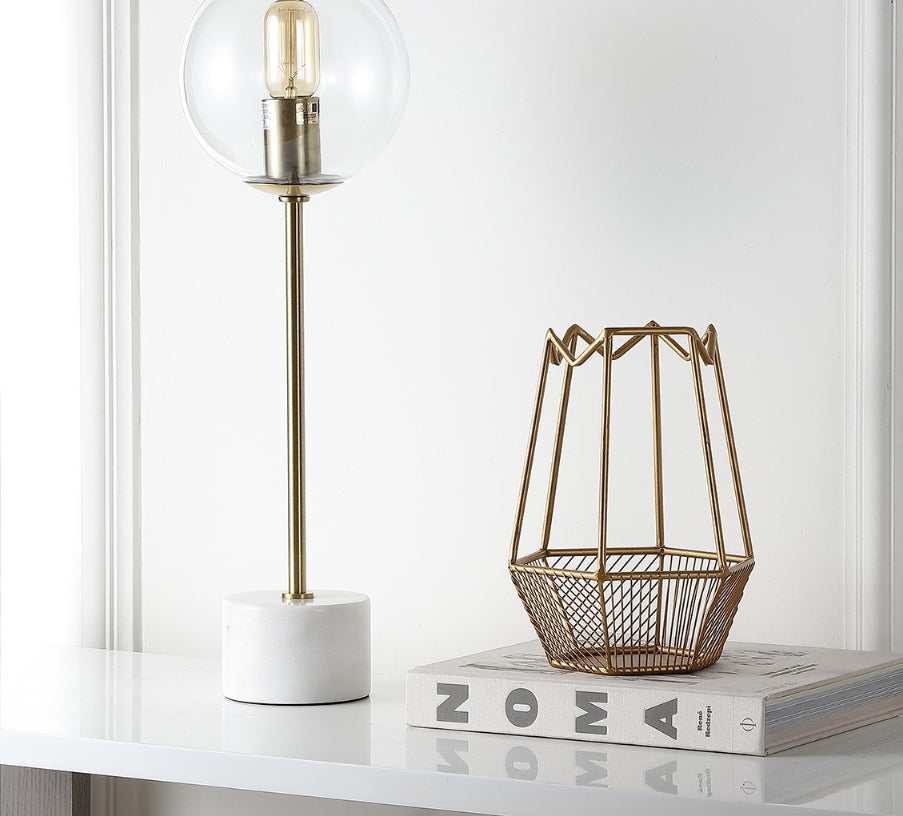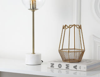 A blend of luxe materials and modern style, this contemporary table lamp refreshes any living room. Its deluxe metal design features a brass and gold finish that shimmers in the glow of its vintage style globe. Designers love its white marble plinth.