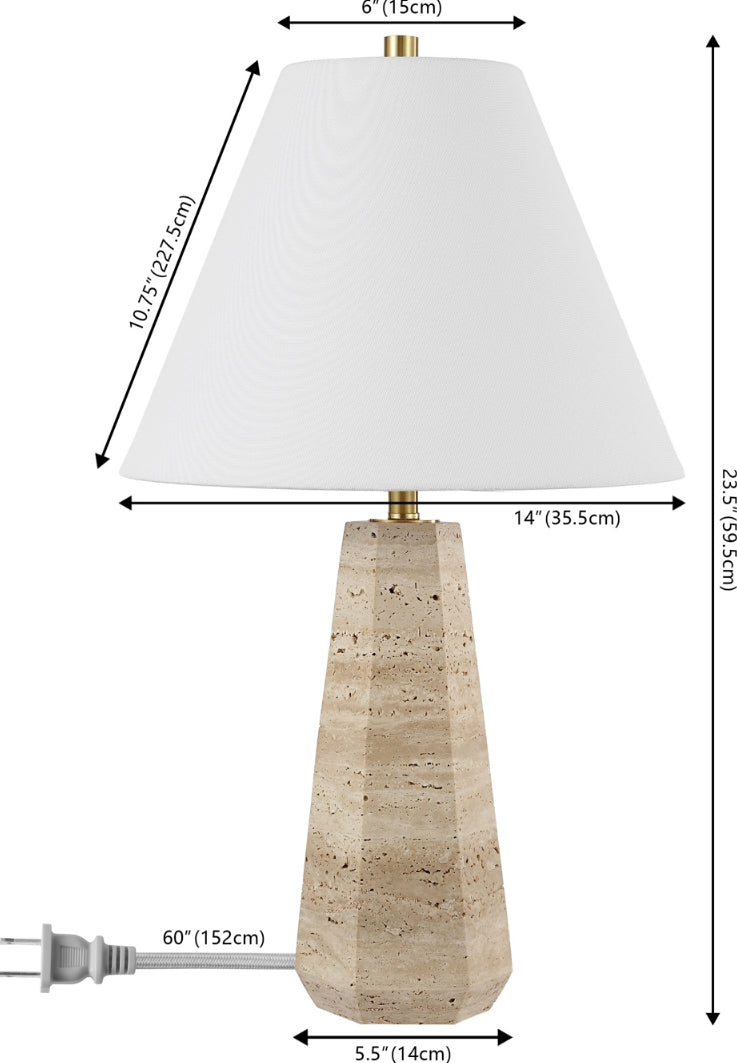 Illuminate your space with the natural elegance of the CALLA TABLE LAMP. This lamp showcases a beautiful beige travertine body that brings a touch of nature-inspired texture to your home. Its geometric form, paired with a soft fabric shade, creates a balanced aesthetic that is both sophisticated and inviting.