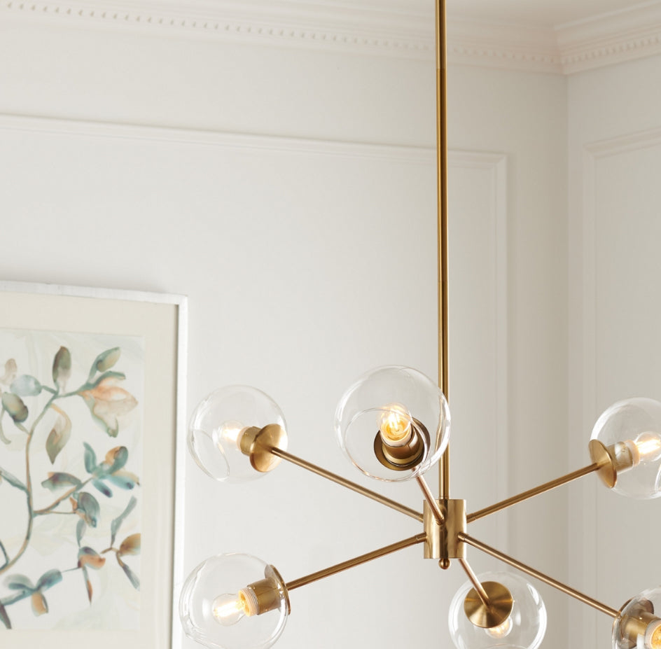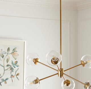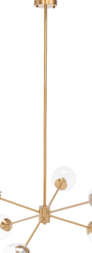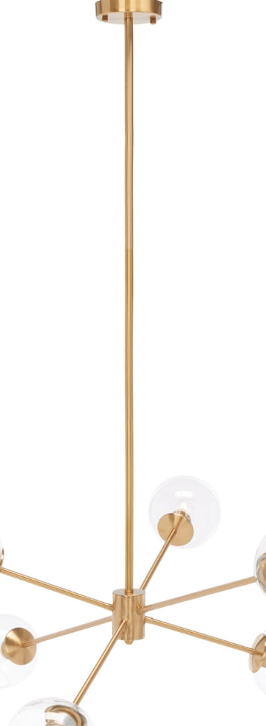 A modern take on Sputnik-style lighting, this Cantori Chandelier is a showstopper. Cantori's sleek gold metal frame shines from the glow of its uniquely shaped clear glass shades, casting a fashion-forward gleam in any room.