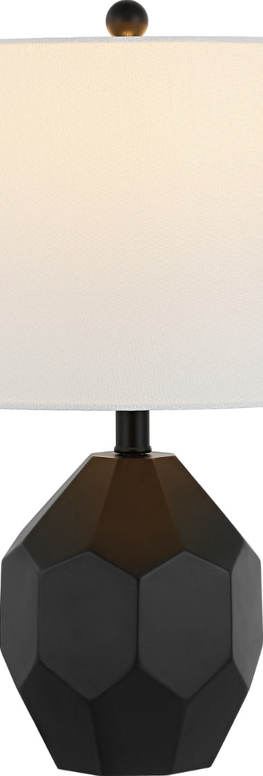 Bring style to any tabletop with the sleek geometric appeal of our Danilo table lamp. Skillfully crafted from resin, our table lamp features a beautifully faceted body to attain a geometric and eye-catching presence. It features a high-contrast finish with a black body and a sleek white shade to make a bold visual impact. Our sleek and stylish table lamp diffuses a soft glow to offer the perfect touch of light and elegance to a bedroom or lounge.