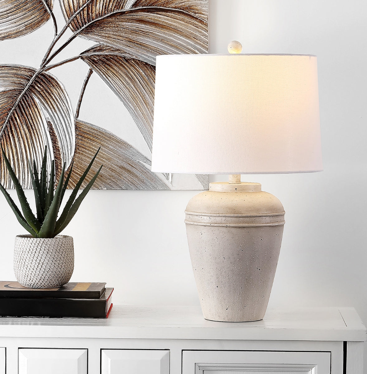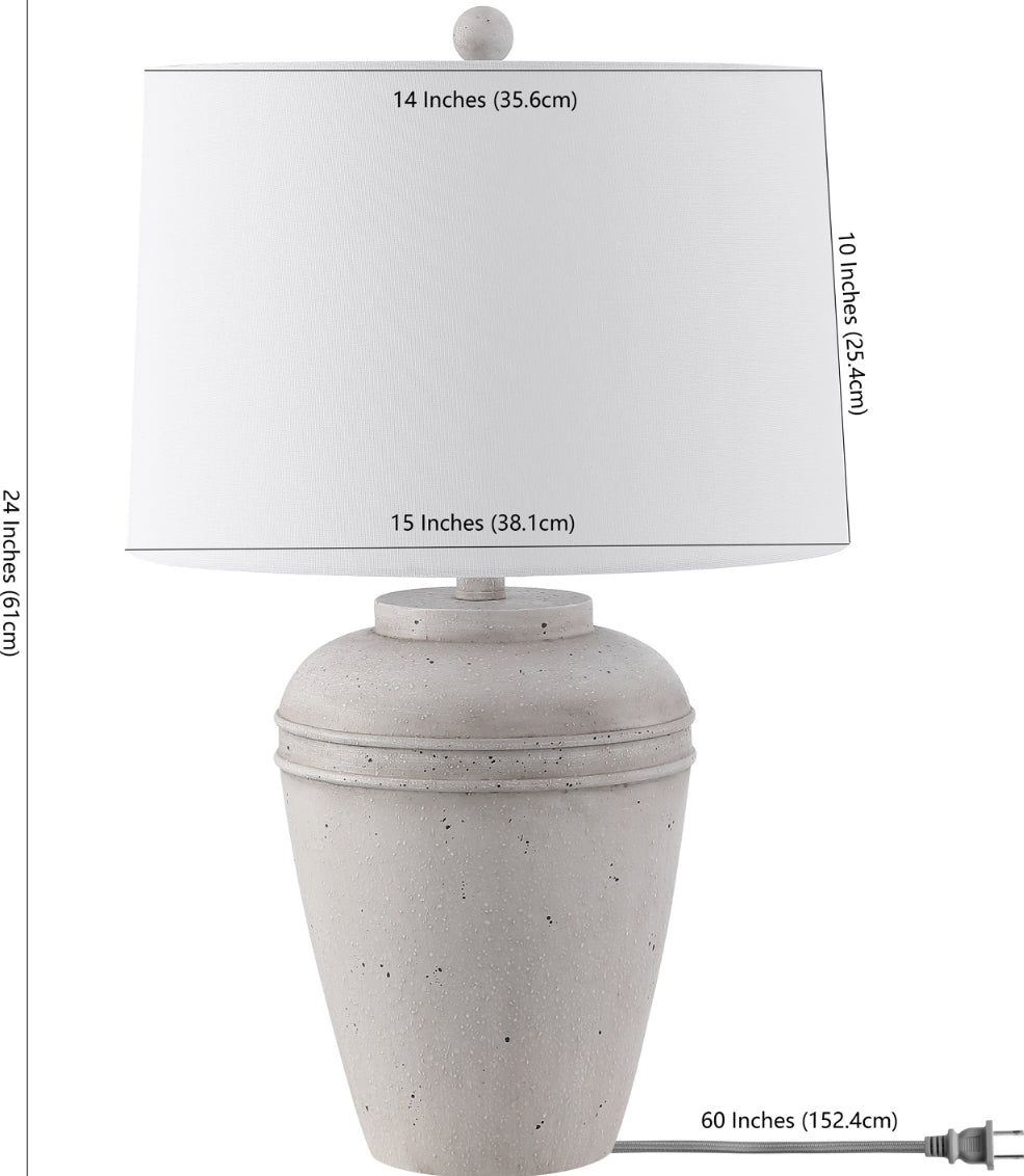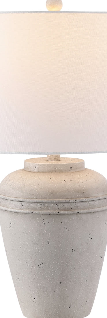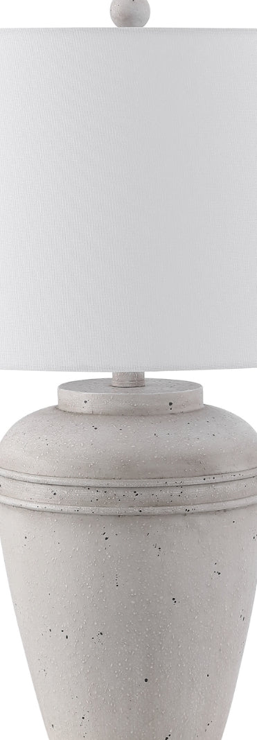 Styled after ancient earthenware vessels, this Demlin Table Lamp is at once classic and contemporary. An antique weathered finish over its grey poly-resin body provides an authentic vintage look, while a clean-lined drum shade makes Demlin a new modern masterpiece.