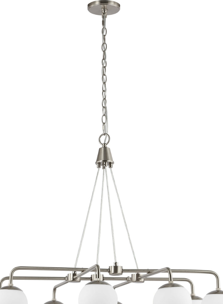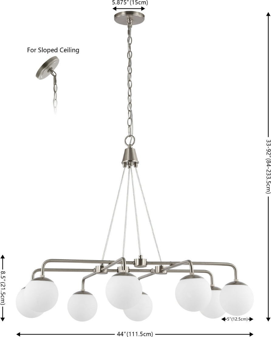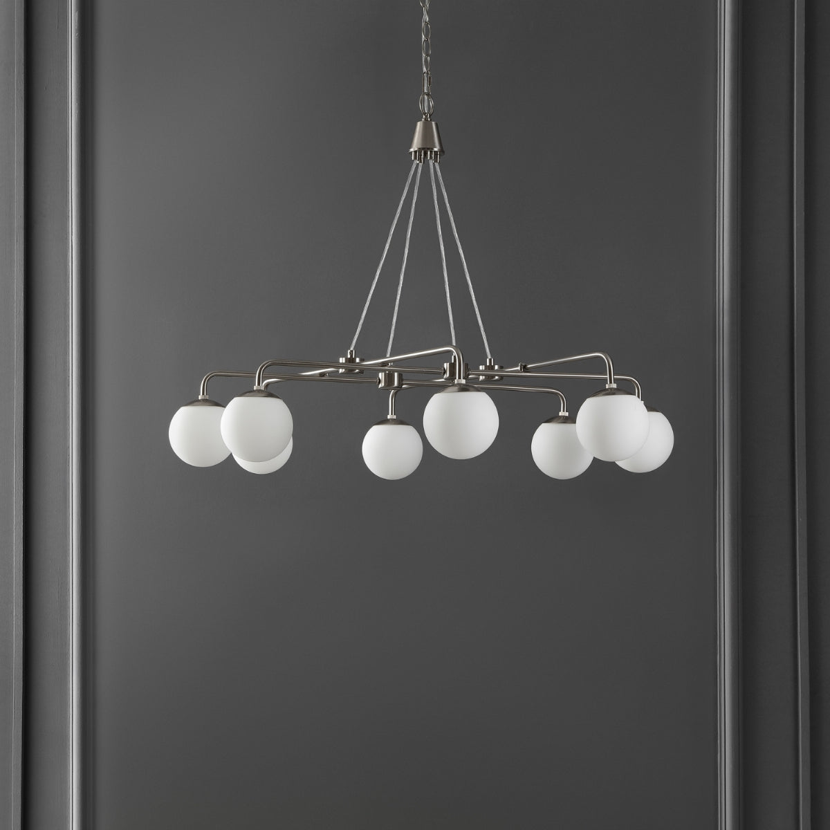Illuminate your home in style with our sophisticated Denneau Chandelier. Our stunning chandelier lends mid-century undertones to an utterly sleek and modern design. Its clean-lined arms suspend frosted glass globes for a stunning transitional appeal. Our chandelier adorns a nickel finish to attain a chic and sophisticated presence in any room. The frosted shades softly diffuse light to present a modern and elegant way to illuminate your entryway, dining room, or living space.