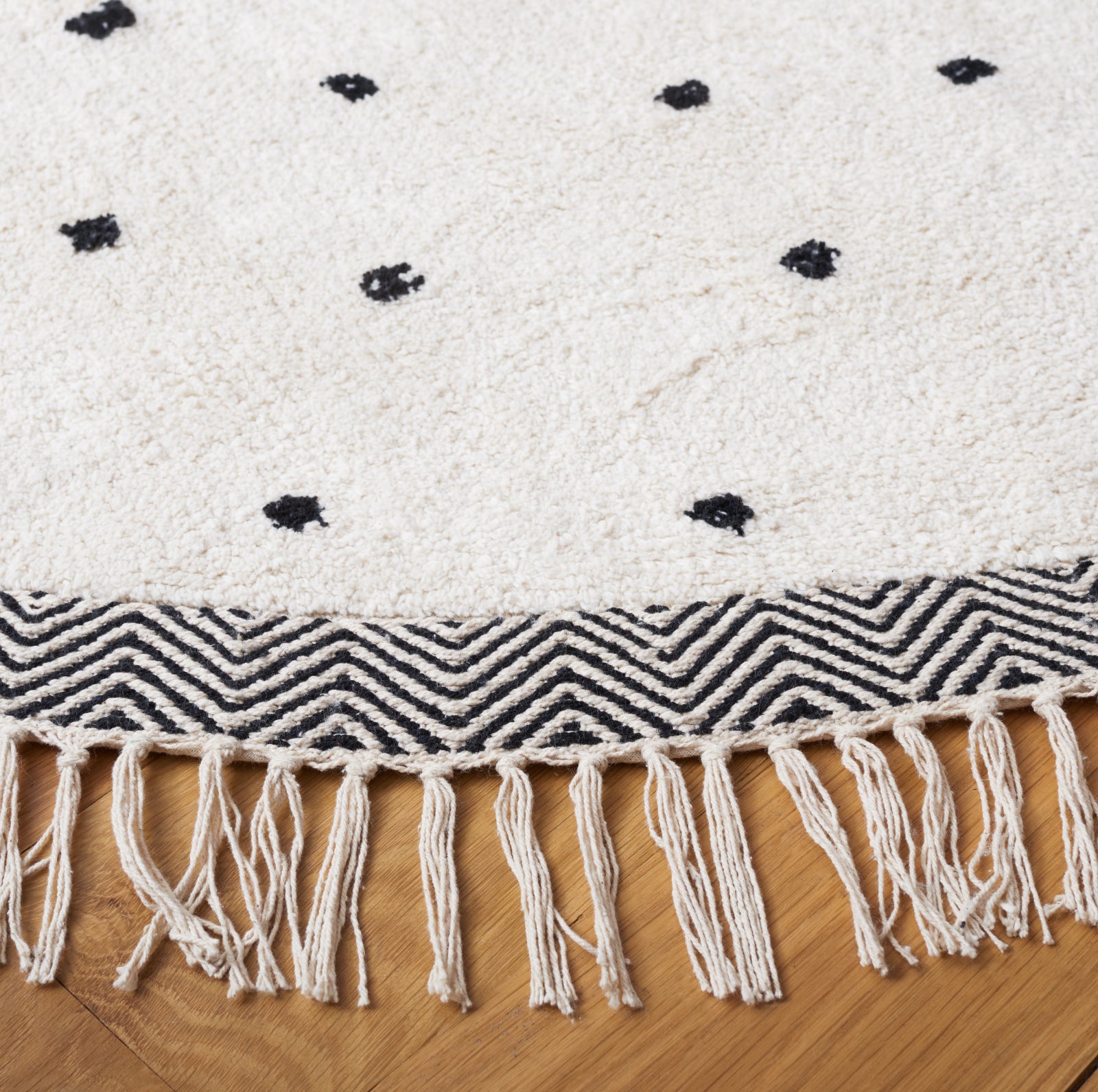 Introducing the 7' X 7' round Hand Woven Indian Ivory/Black Area Rug. This stunning piece is not just a rug, it is a testament to traditional Indian craftsmanship and a modern blend of style, texture, and elegance. Made of high-quality cotton, this round-shaped rug features a balanced palette of ivory and black, seamlessly blending with any existing decor while adding a layer of comfort and chic style. With a height of 3/8'', it provides a plush feel underfoot without compromising room space. Being hand-woven, it exudes a charm that adds warmth and character to any room. And the best part, it's washable ? bring it to life anytime with a good rinse! Don?t just cover your floors, adorn them with this magnificent ivory/black 7' round rug, a true reflection of sophistication and high-quality artistry.