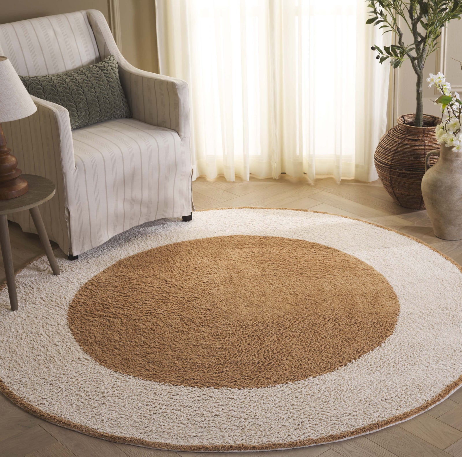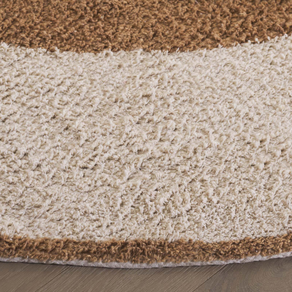 Experience the blend of rustic charm and superior craftsmanship with our 3' X 3' Round Area Rug in the delightful hues of Ivory and Light Brown. Skillfully hand-tufted by artisans in India, this rug epitomizes exceptional design and quality. The round shape brings a unique aesthetic that seamlessly complements any room, delivering both luxury and warmth. Boasting a comfortable height of 3/8'', this rug offers plush comfort underfoot. Created using recycled cotton, this rug contributes to sustainability while promising durability and resilience. Transform your living space into a harmonious haven with this Indian handcrafted gem!