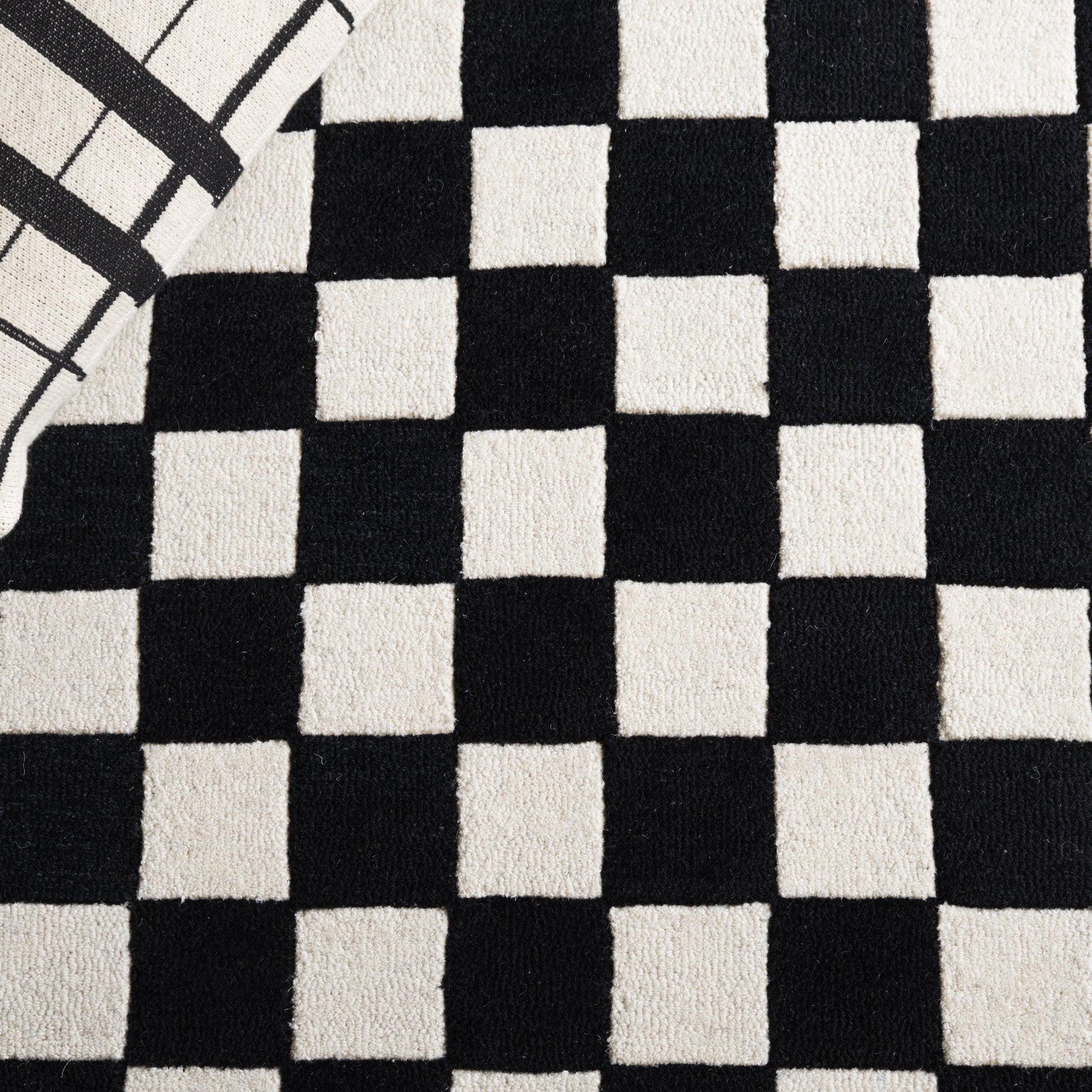 Introducing our commanding 2'3'' X 8' Black/Ivory Checkered Runner Rug ? a cutting-edge asset that fuses function and fashion effortlessly. Rendered in sophisticated shades of black and ivory, its contemporary style and dashing checkered pattern are not just visually pleasing, but also capable of redefining the aesthetics of any space. Envisioned in India using a refined hand-tufted technique, this runner offers an incomparable blend of quality and creativity. Revel in the luxury of 80% wool and 20% cotton composition, coupled with a high-density 1/4'' pile height that promises unmatchable comfort. This rug personifies elegance, durability, and lustrous charm, impeccably designed to complement your modern home decor. It?s not just a rug, it's an expression of taste and a statement of style.