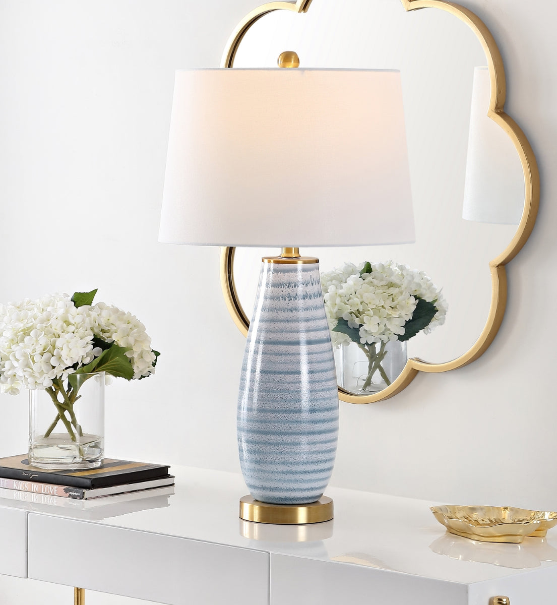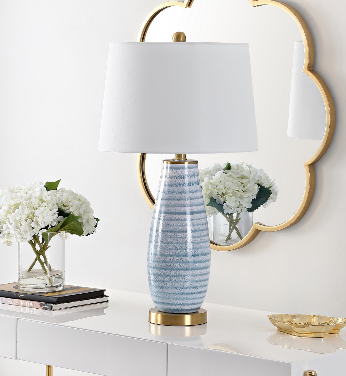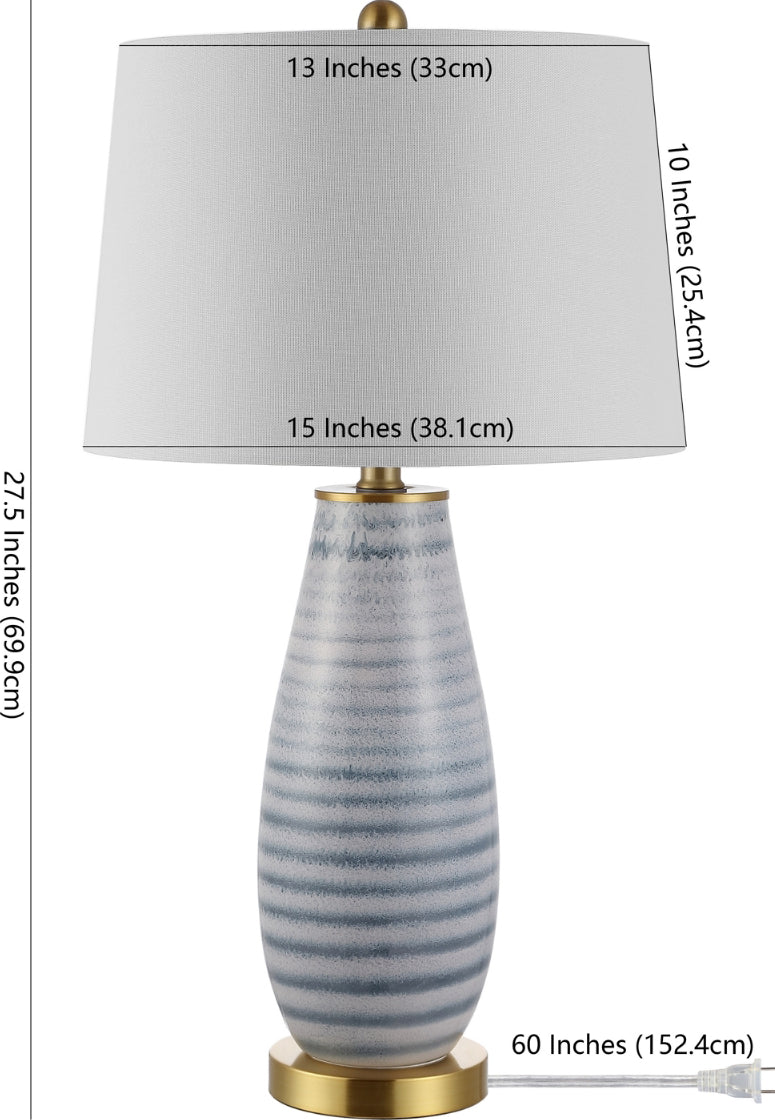 This striking Eliana Table Lamp takes its inspiration from the organic striations and eye catching tones of geologic rock strata, making it a natural work of art for any interior. Eliana's subtly curved silhouette beautifully offsets the linear details that dance across its blue and white ceramic body.