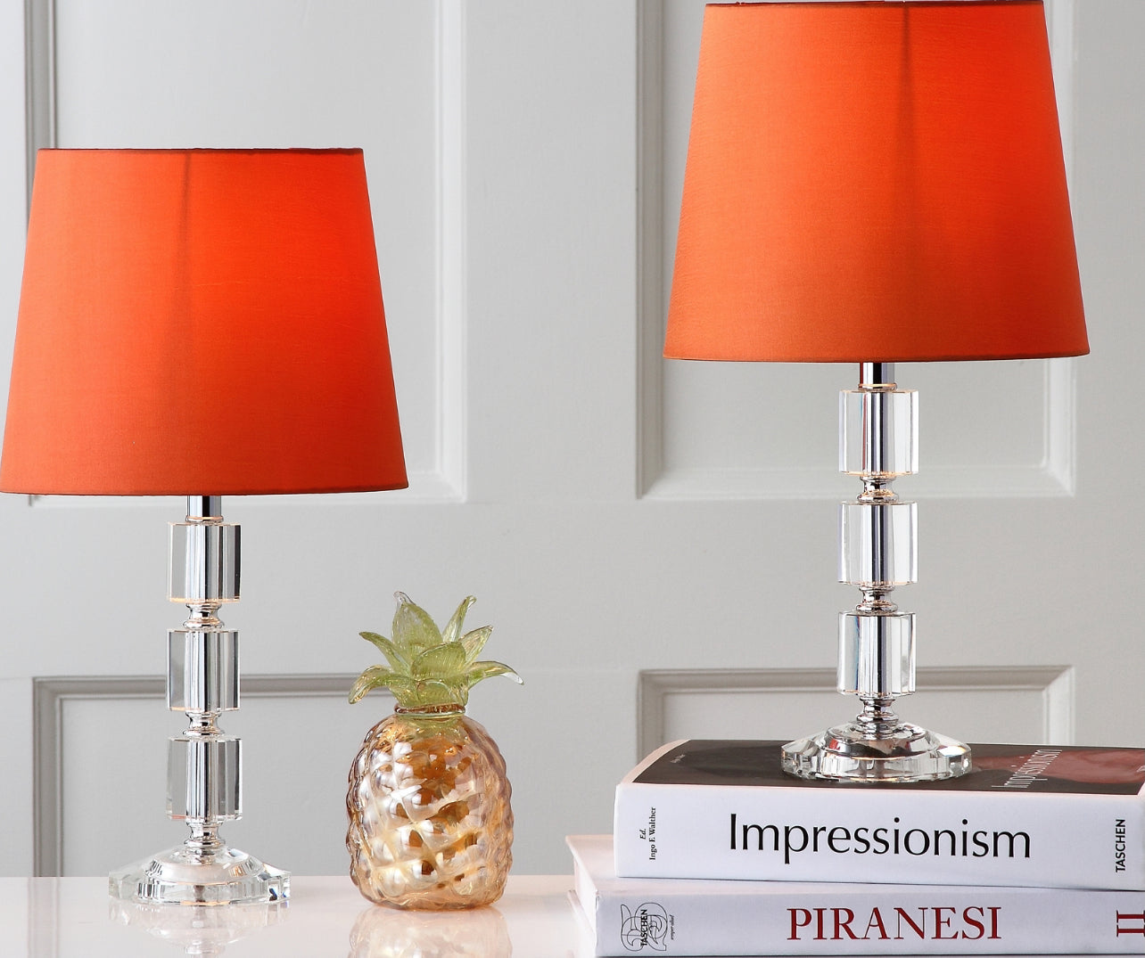 The pure elegance of crystal is celebrated in the faceted Erin Crystal Cube Table Lamp. Chic and sophisticated, this stunning set of two lamps brighten a study, library, or living room with glamorous Deco style. Erin is topped with an orange barrel shade for a fashion smart contemporary touch.