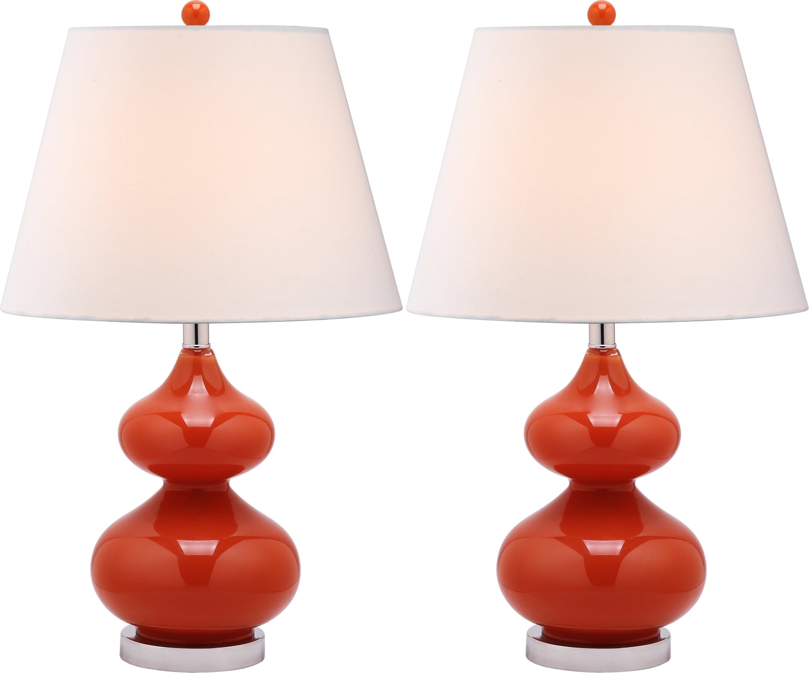 Illuminate any living space in style with the blood orange Eva Double Gourd Lamp (set of two). Topped with a matching finial and accented with silver finishes, Eva's off white cotton shade gives a classic touch to its curved glass body.