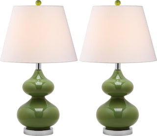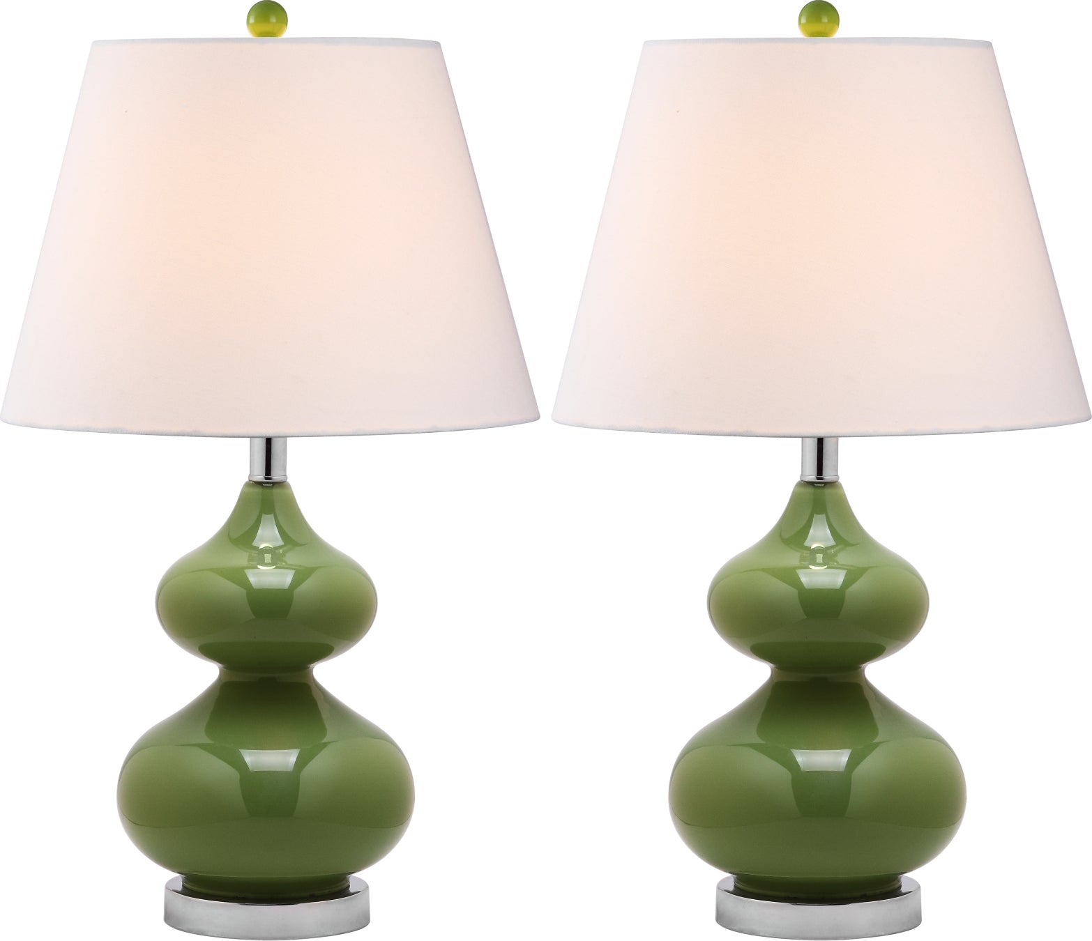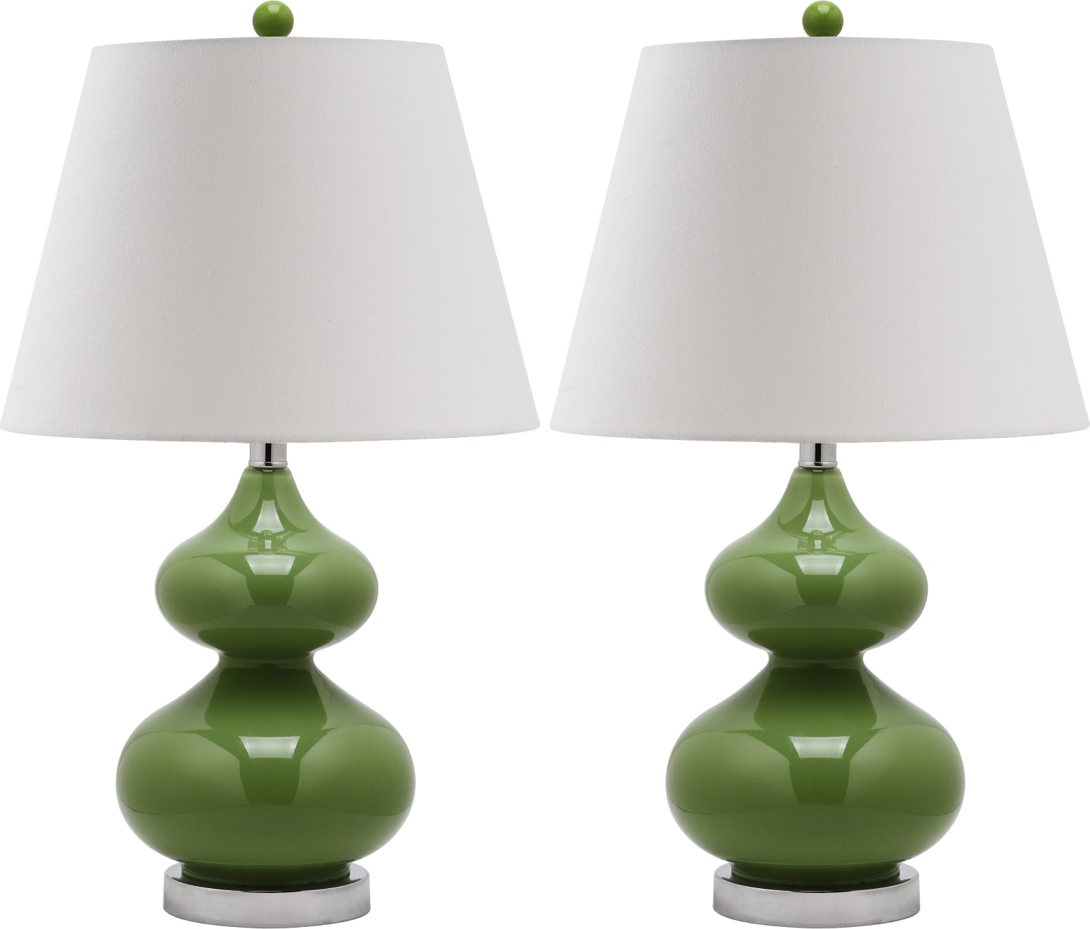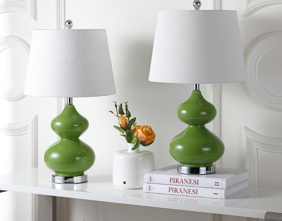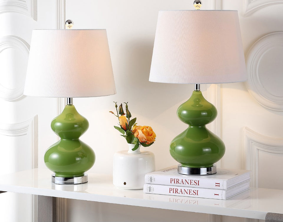 Illuminate any living space in style with the fern green Eva Double Gourd Lamp (set of two). Topped with a matching finial and accented with silver finishes, Eva's off white cotton shade gives a classic touch to its curved glass body.