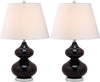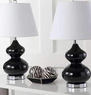 Illuminate any living space in style with the sleek black Eva Double Gourd Lamp (set of two). Topped with a matching finial and accented with silver finishes, Eva's off white cotton shade gives a classic touch to its curved glass body.