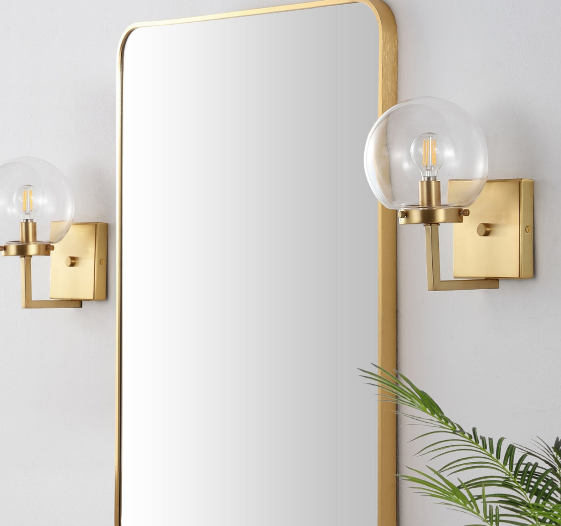 Brighten up your home with the timeless elegance of our Ganon wall sconces. Taking inspiration from vintage lamps, the wall sconce is refined to its striking essentials. A sleek and upright arm holds our eye-catching spherical glass shade. It combines the sheen and shine of brass with the elegance of clear glass to make a sleek statement on your wall. The clear glass shades allow the bulb to shine, illuminating your home with warm ambient light.