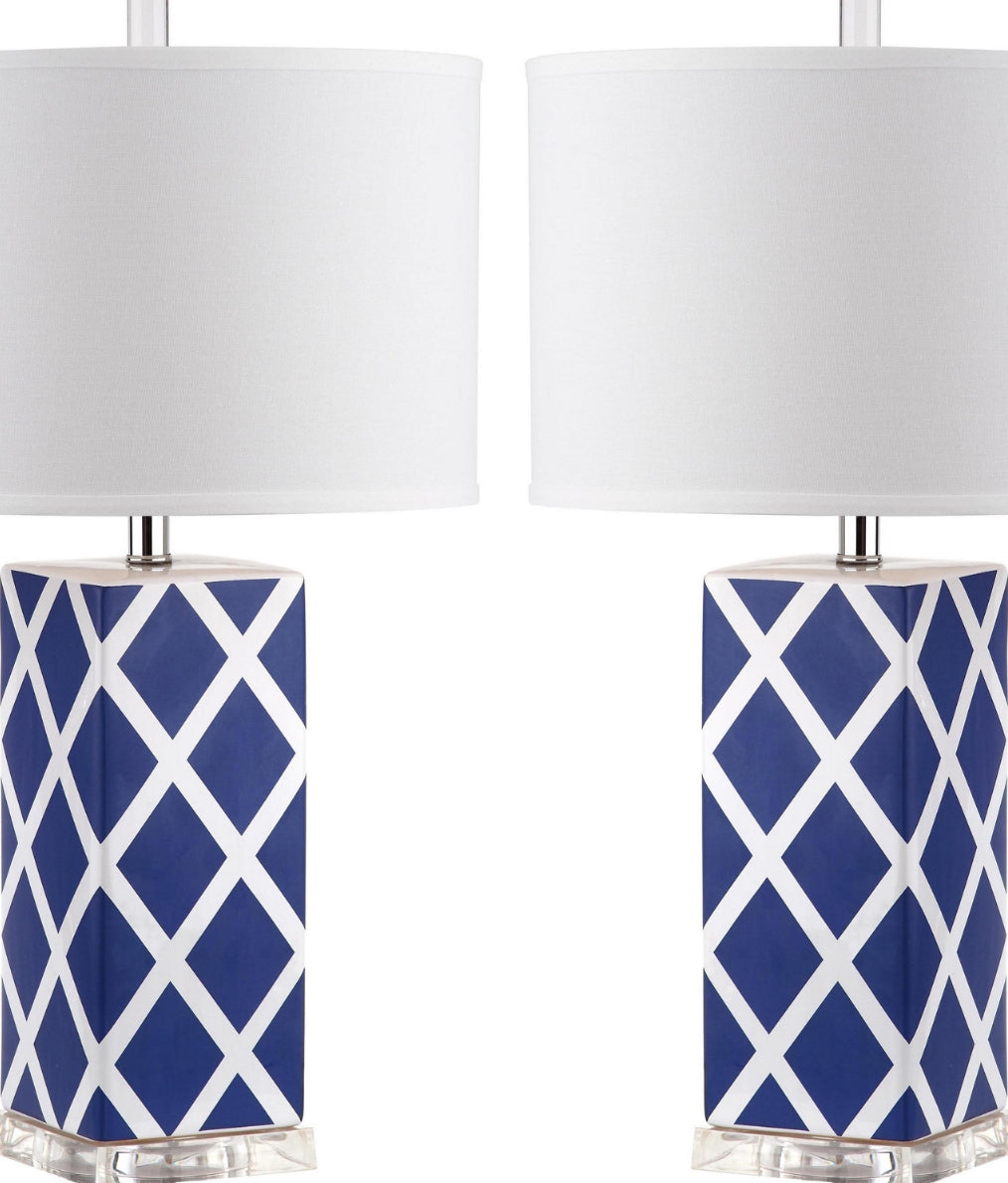 Forever plaid takes on new meaning with the Garden Lattice table lamp by Safavieh. Crafted of navy and white ceramic with acrylic base and a silver neck, this graphic windowpane design is topped with a contemporary white cotton hardback drum shade.