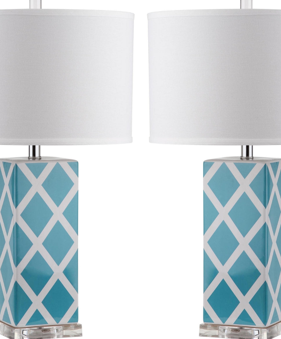 Forever plaid takes on new meaning with the Garden Lattice table lamp by Safavieh. Crafted of light blue and white ceramic with acrylic base and a silver neck, this graphic windowpane design is topped with a contemporary white cotton hardback drum shade.
