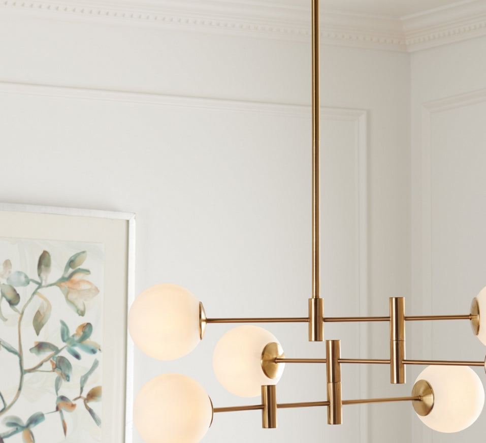 Like many glowing moons in orbit, this Gideon Chandelier illuminates any room with ethereal elegance. Gideon revitalizes retro-chic lighting for today's modern interiors with an antique gold frame and white glass spheres, artfully staggered to emanate a breathtaking sense of depth and motion.