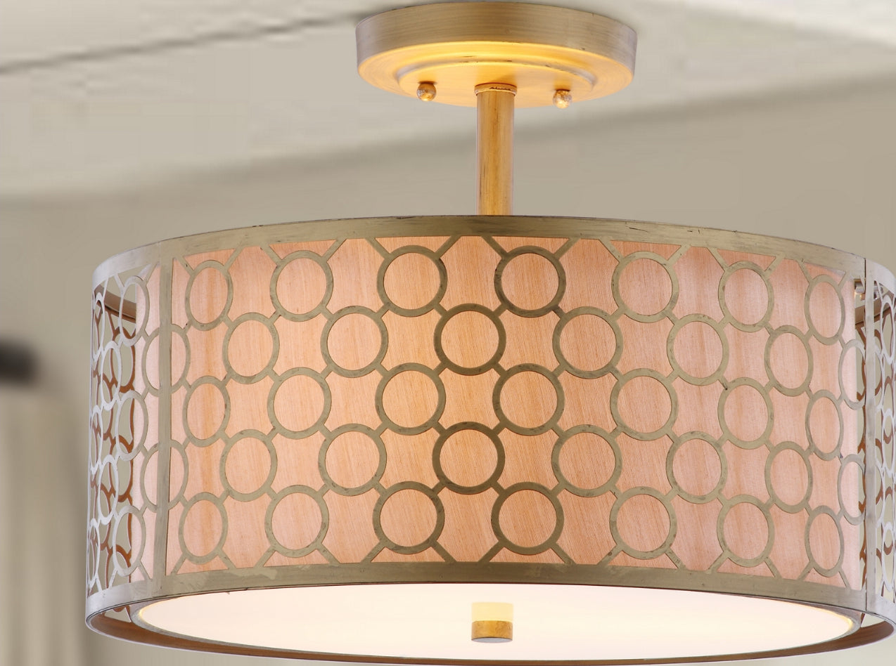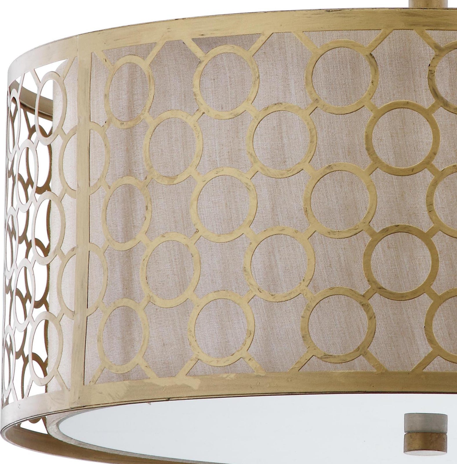 A distinctive marriage of a cream fabric shade with geometric patterned laser cut steel in antique gold finish, the Giotta ceiling light showcases the glamorous drum shade within a shade trend. Giotta is ideal for a transitional kitchen, bedroom, or hall.