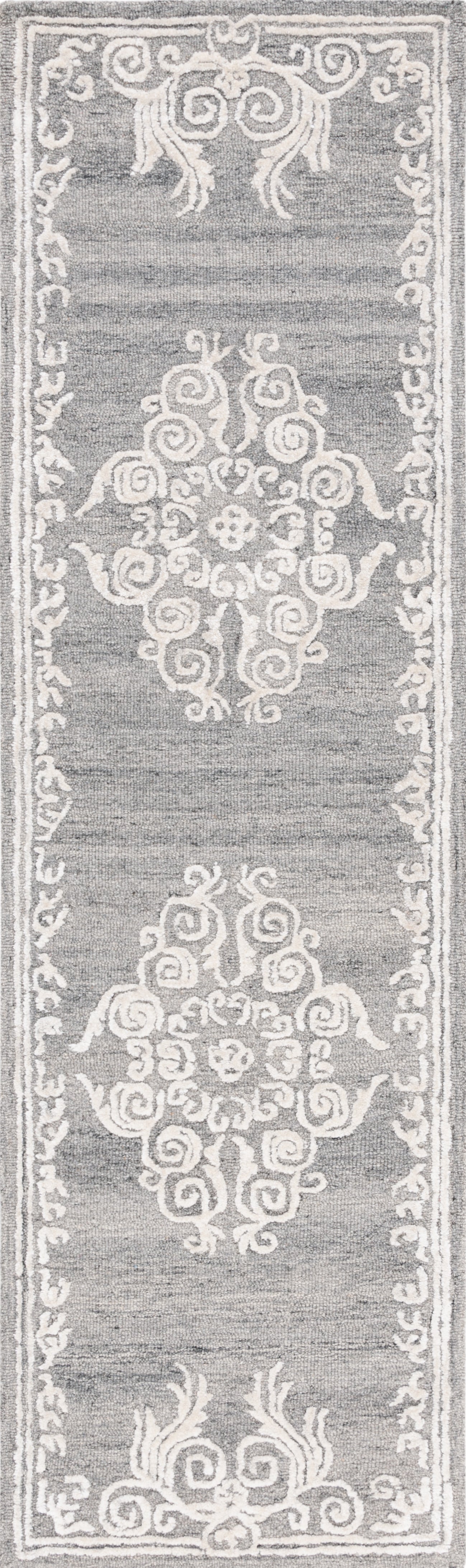 Elevate your home with the exquisite charm of our Modern Grey/Ivory Runner Rug, a hand-tufted masterpiece that blends timeless tradition with contemporary elegance. Designed to enrich your hallway or living space, this 2'-3'' X 8' runner is thoughtfully crafted in India, using a luxurious combination of 55% wool, 35% viscose, and 15% cotton, with latex backing to ensure durability and comfort underfoot.