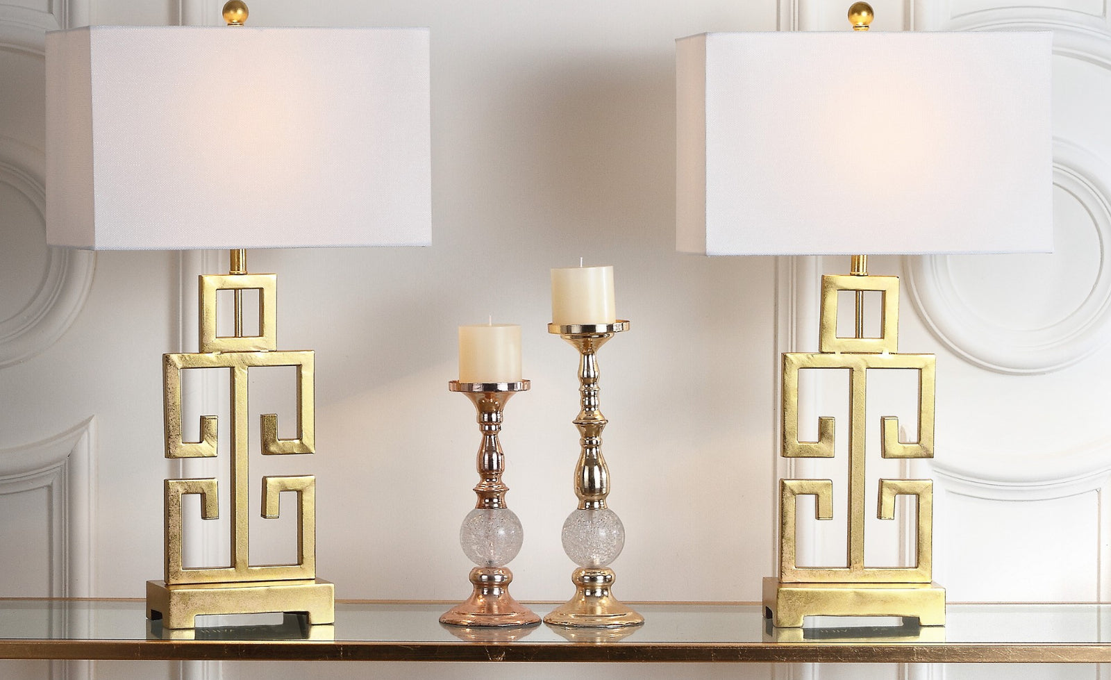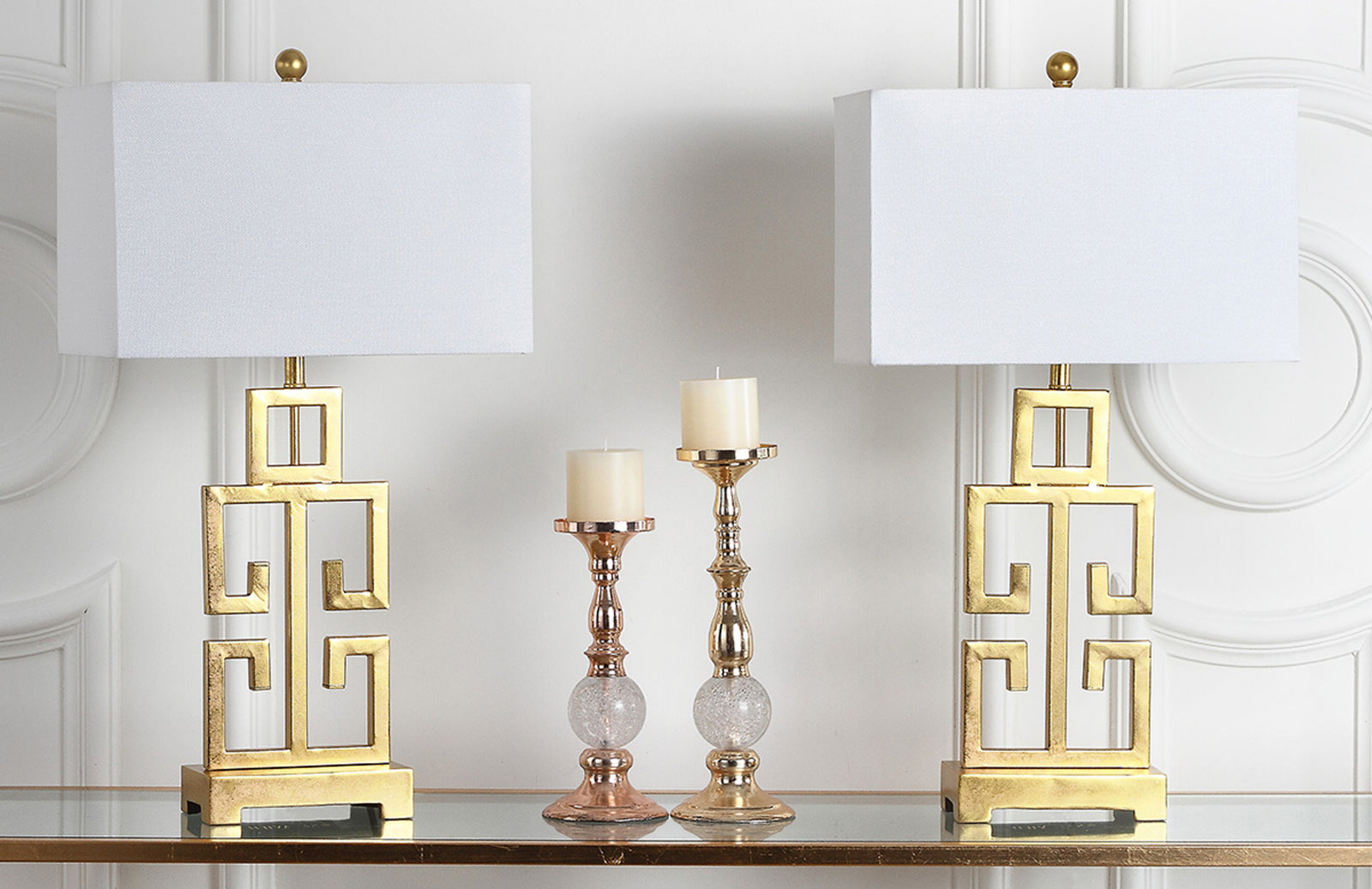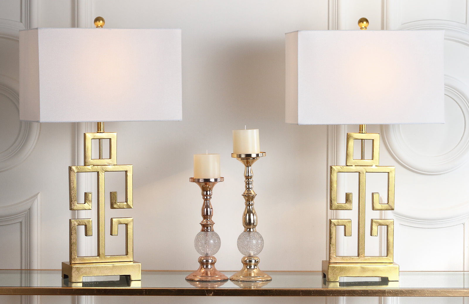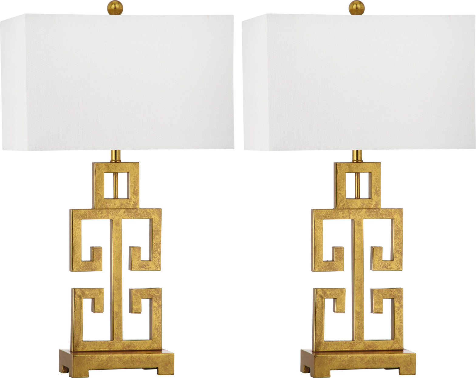Infinitely versatile and adaptable to myriad decorating styles, the set of two Greek Key table lamps stars the iconic Greek symbol for infinity. This design is crafted of antique gold finished metal with a rectangular box shade in white textured cotton.