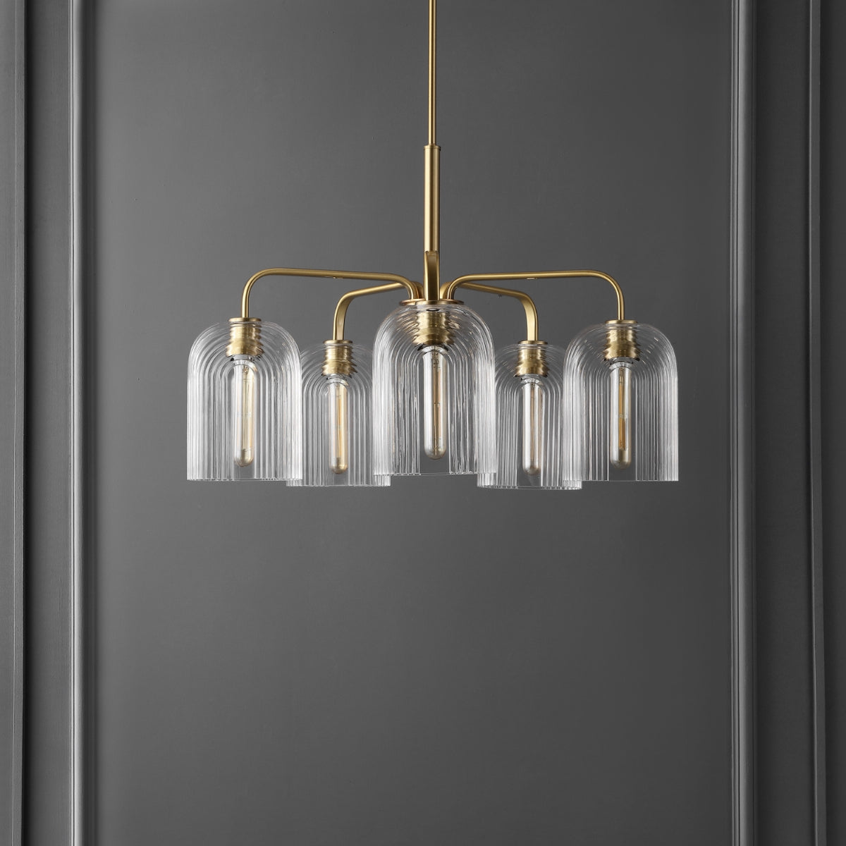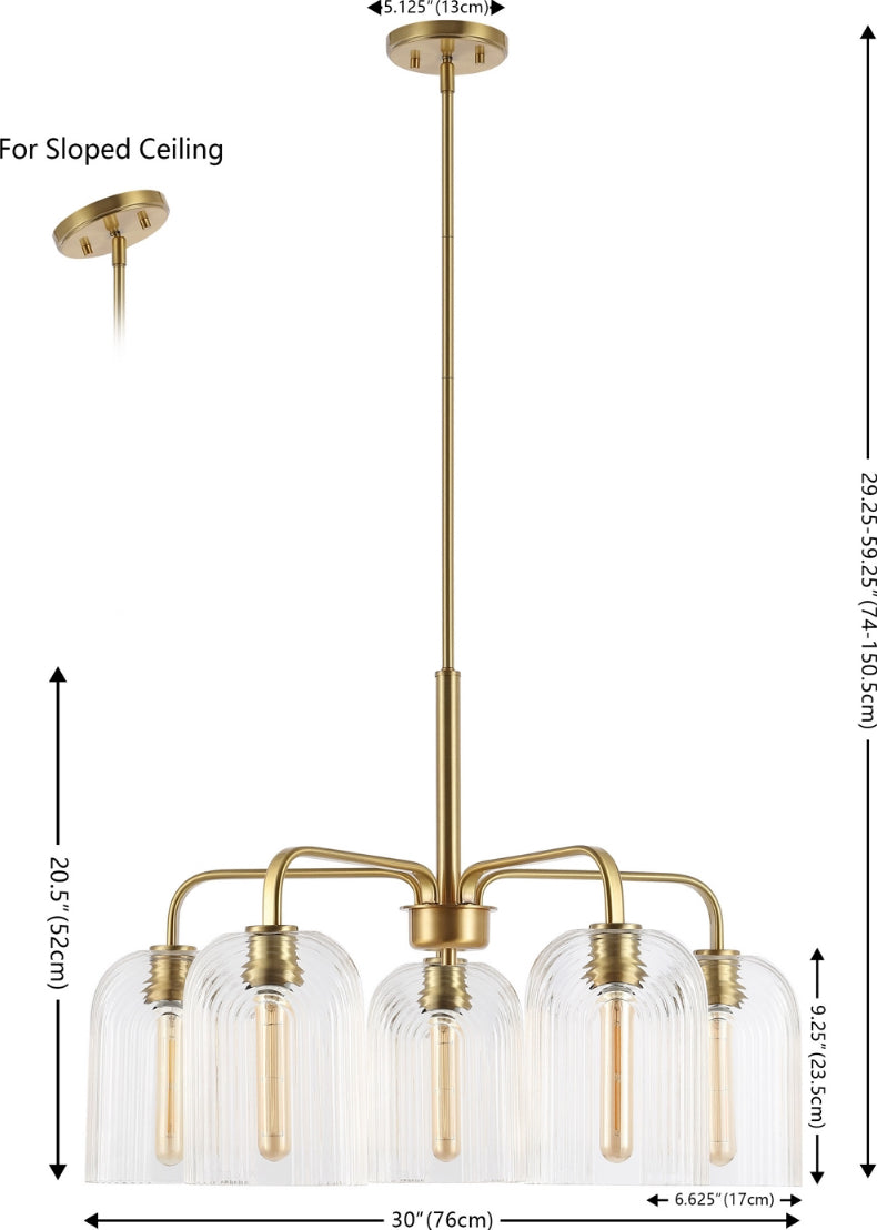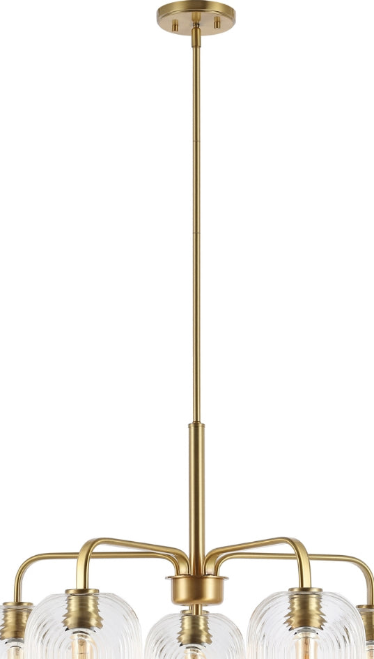 Add a refined touch of glamour to any room with our dazzling Idelle pendant. A ready-made stunner, our pendant impresses with its refined design and polished details. Its streamlined arms hold the sleek and eye-catching glass shades. A ribbed detail follows the curvature of the shades to lend a dramatic edge to our pendant light. Accented with brass, the pendant adds luxe character to any room. It includes five lights to offer a radiant glow to your entryway, dining space, or living area.