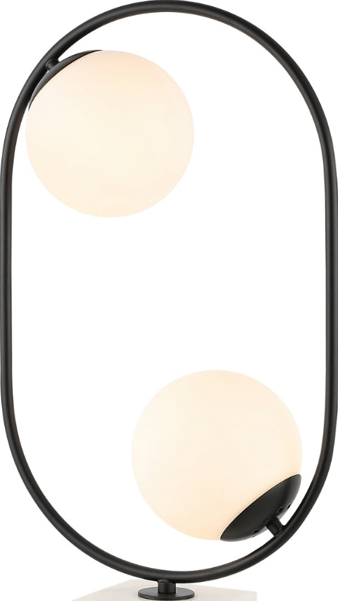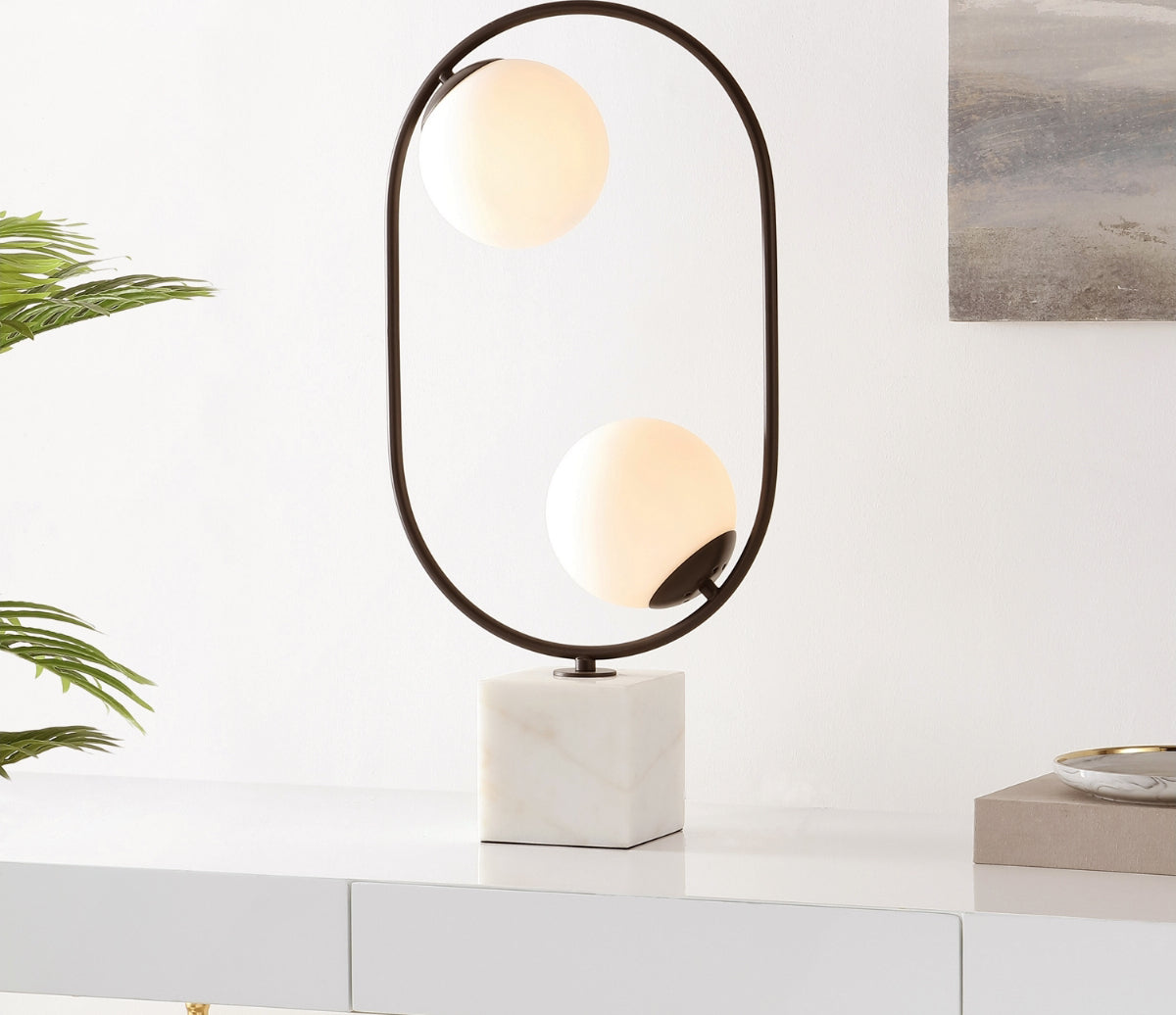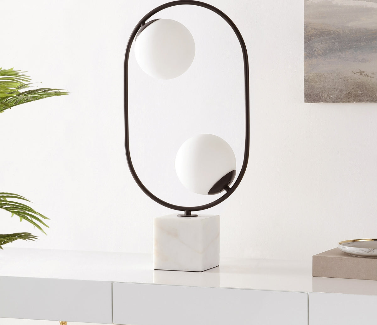 Enhance your decor with the stunning modern art look of this Imrie Table Lamp. Overflowing with a rich sense of depth and motion, Imrie's two white glass globes and black oval metal frame are beautifully balanced by its glamorous white marble pedestal base.