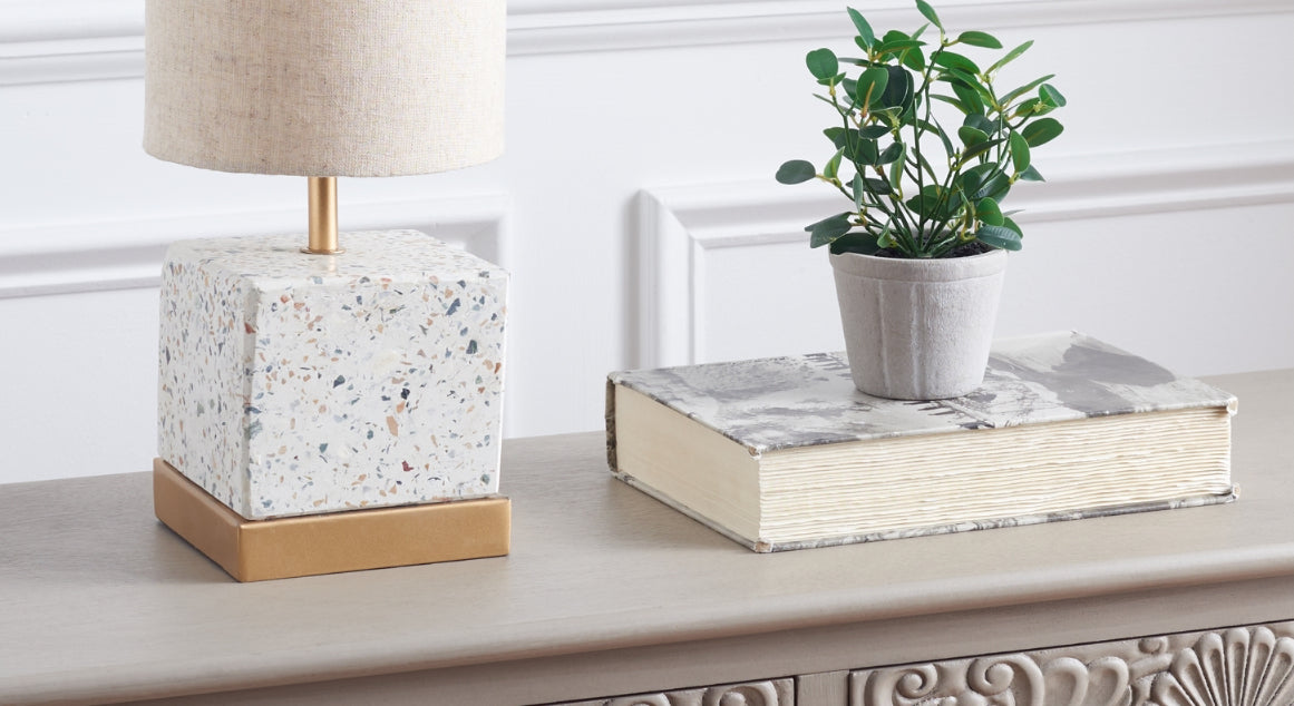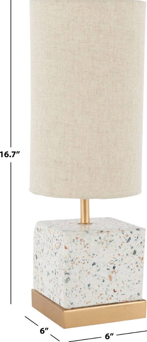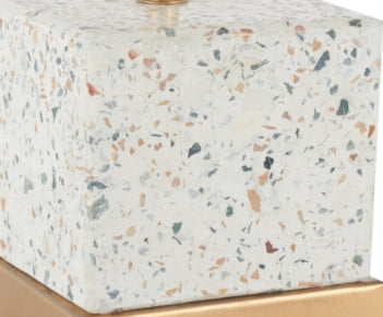 Add a modern and lively flair to your home with the Jarelle table lamp. The concrete base of the table lamp is speckled with stone fragments to serve as a playful and welcoming addition to your home. Its tall drum shade creates a sleek contrast with the rectangular concrete body. Accented with a gold metallic finish, the table lamp showcases a dramatic play of textures, shapes, and proportions to enliven any bare surface of your home.