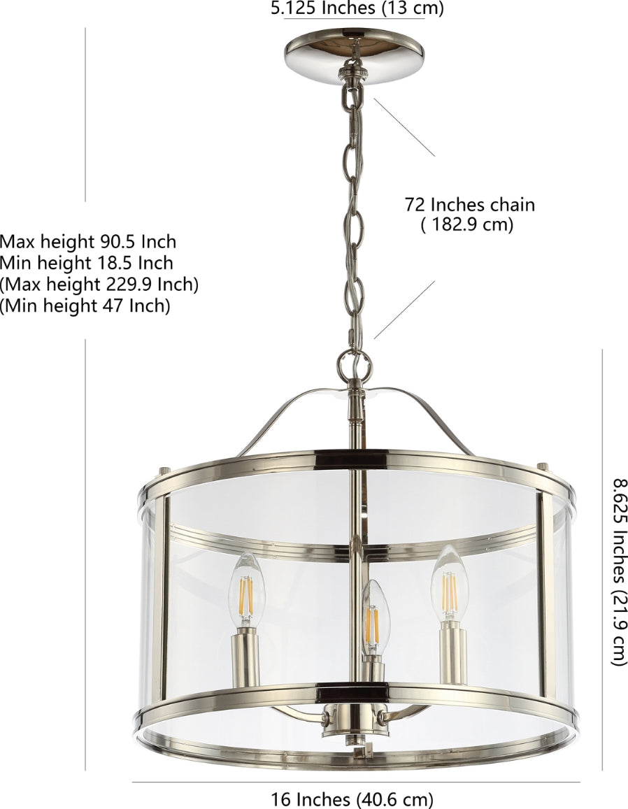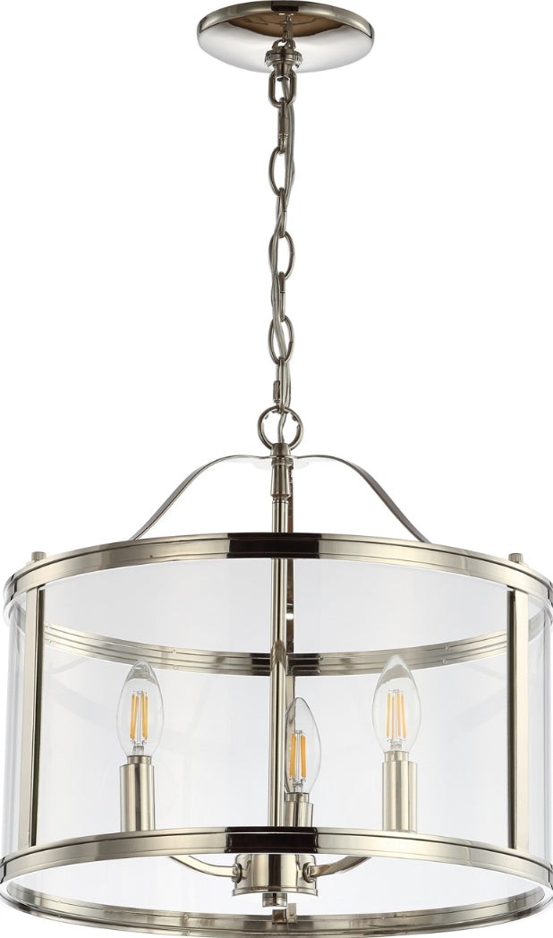 Bring modern luxury to any living room with this classic pendant. Posh and polished, its chandelier bulbs' gentle glow is diffused through a traditional clear metal and glass shade with a shiny nickel finish. Its versatile style blends with any decor.