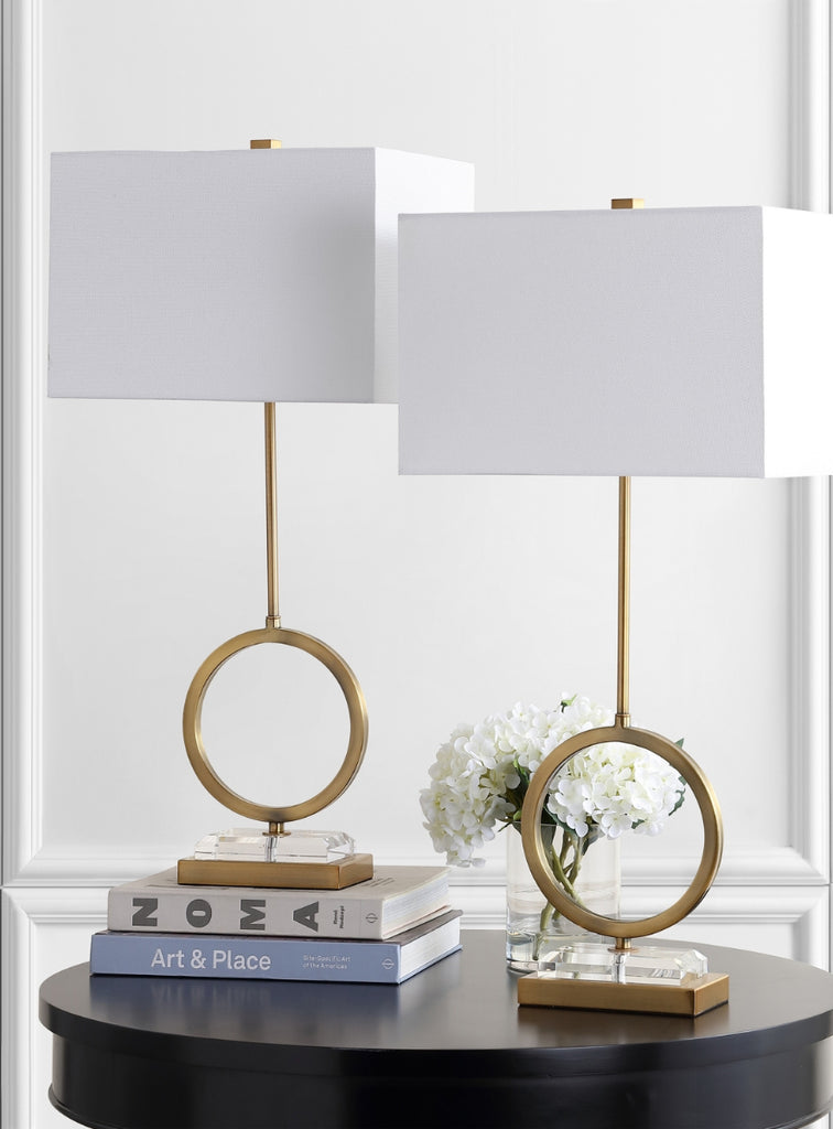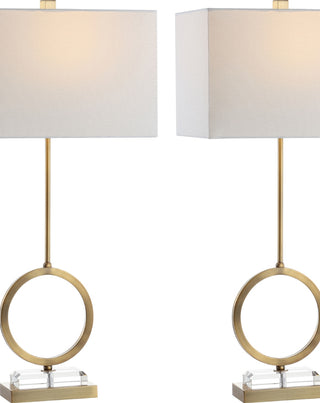 The negative space of a perfect circle lends creative interest to any space with the Kaden Table Lamp. Perfect for Art Deco decor or other clean lined furnishings, Kaden's fascinating geometry, brass body, and cotton shade are must haves for lovers of art inspired interiors. Sold in sets of two.