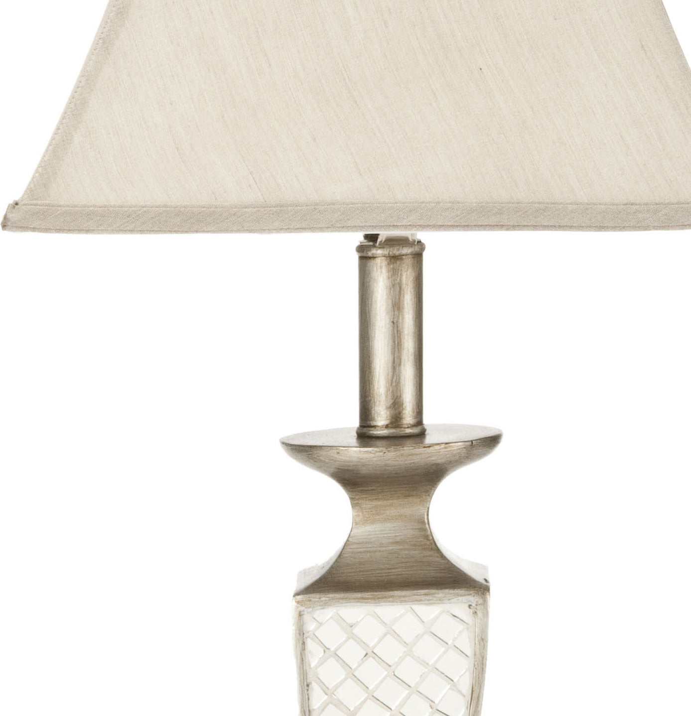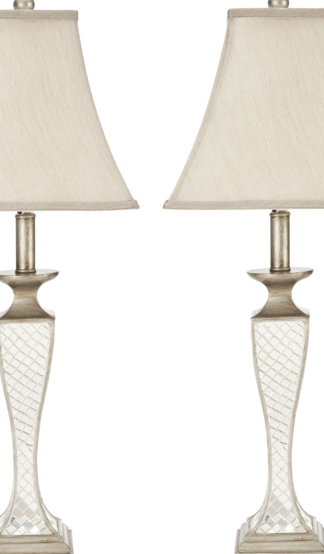 A slender urn shaped body adorned with a delicate square mirror mosaic allows the Kailey Glass Lattice Lamp (set of two) to shine in any traditional setting. Crafted of silver finished resin and topped with a cream empire shade, this beautiful lamp radiates timeless charm.