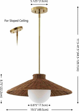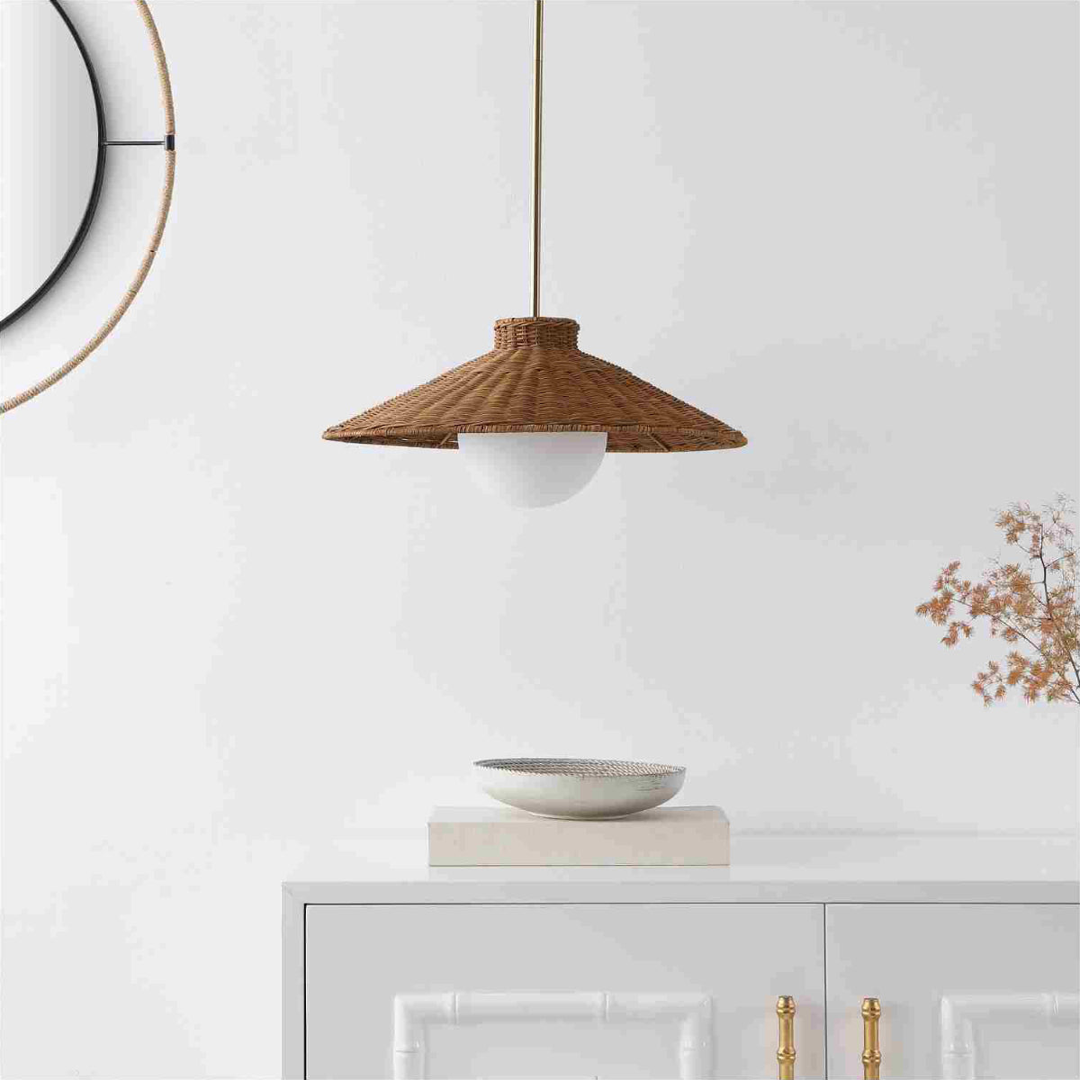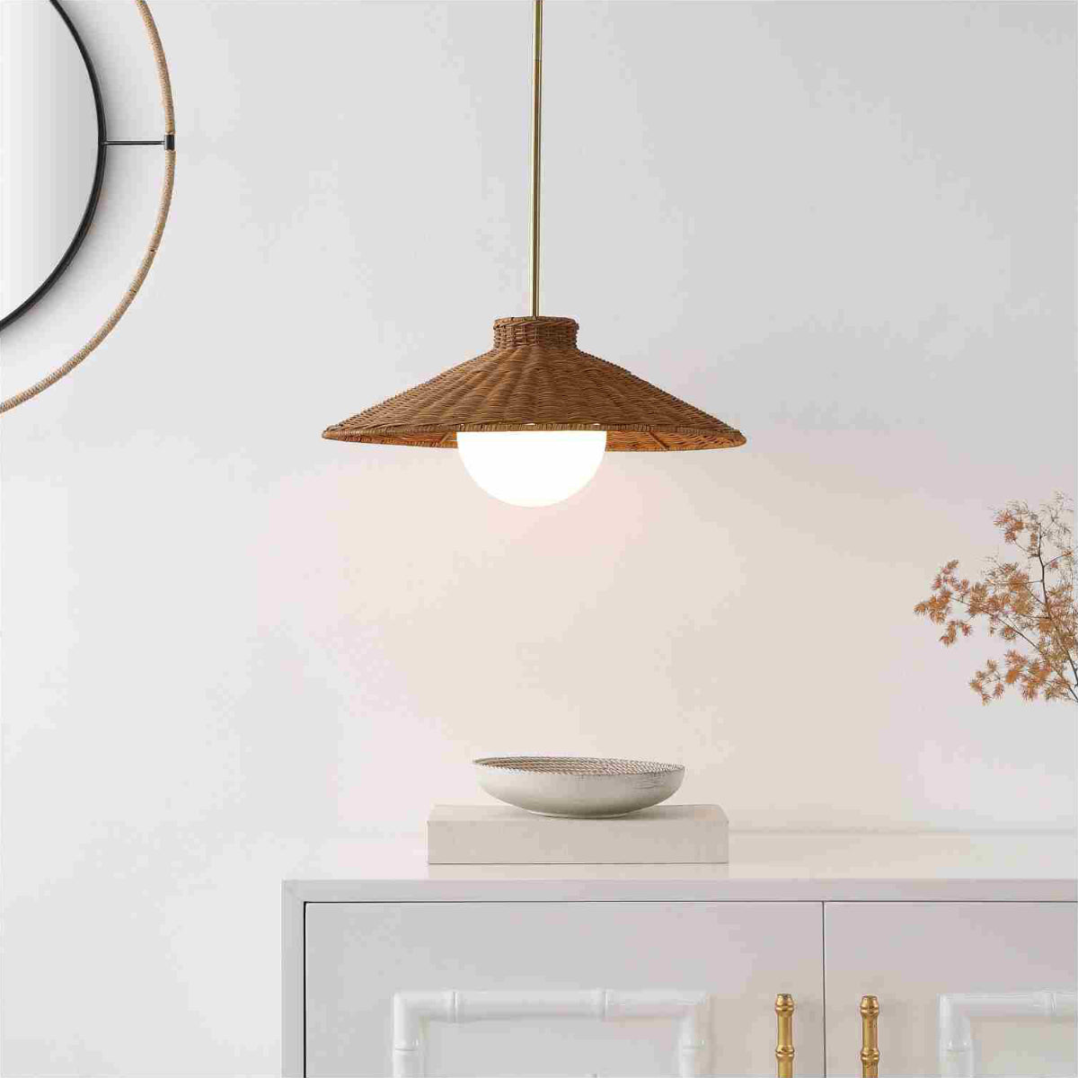 Introducing the Kalena Pendant, an elegant lighting solution that blends natural materials with a touch of sophistication. This pendant features a beautifully crafted rattan body in a charming natural color that exudes warmth and organic appeal. Complementing the rattan is a brass finish that adds a subtle gleam, perfect for a variety of interior spaces. Whether you are looking to illuminate your dining area, entryway, or living space, the Kalena Pendant is a fitting choice for those who appreciate natural beauty with a dash of modernity.