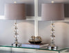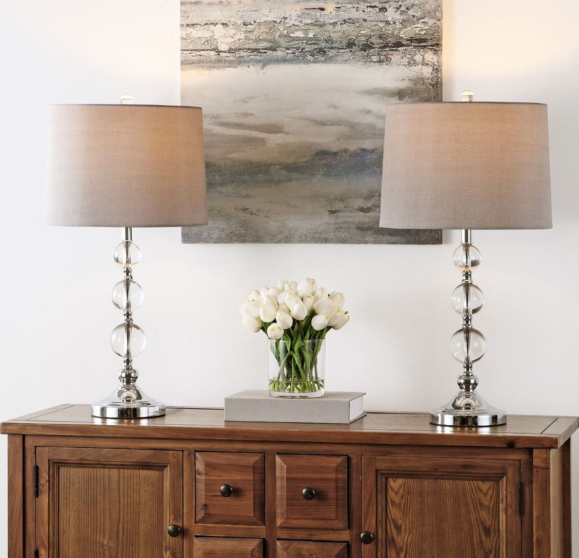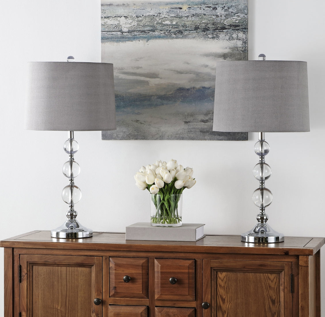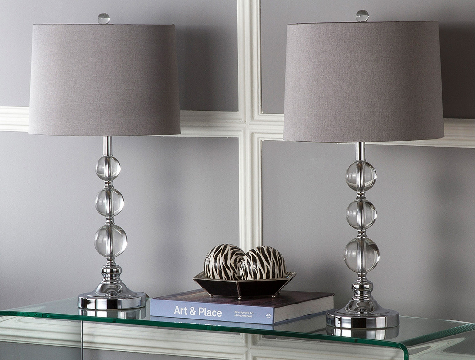 With its chrome candlestick base and three subtly gradated crystal balls, this Keeva Table Lamp is the perfect blend of classic and contemporary design. Shimmering elegantly in any room, Keeva's grey drum shade adds a high-fashion touch. Sold in sets of two. Our table lamp comes with a built-in USB port to keep your devices charged at all times.