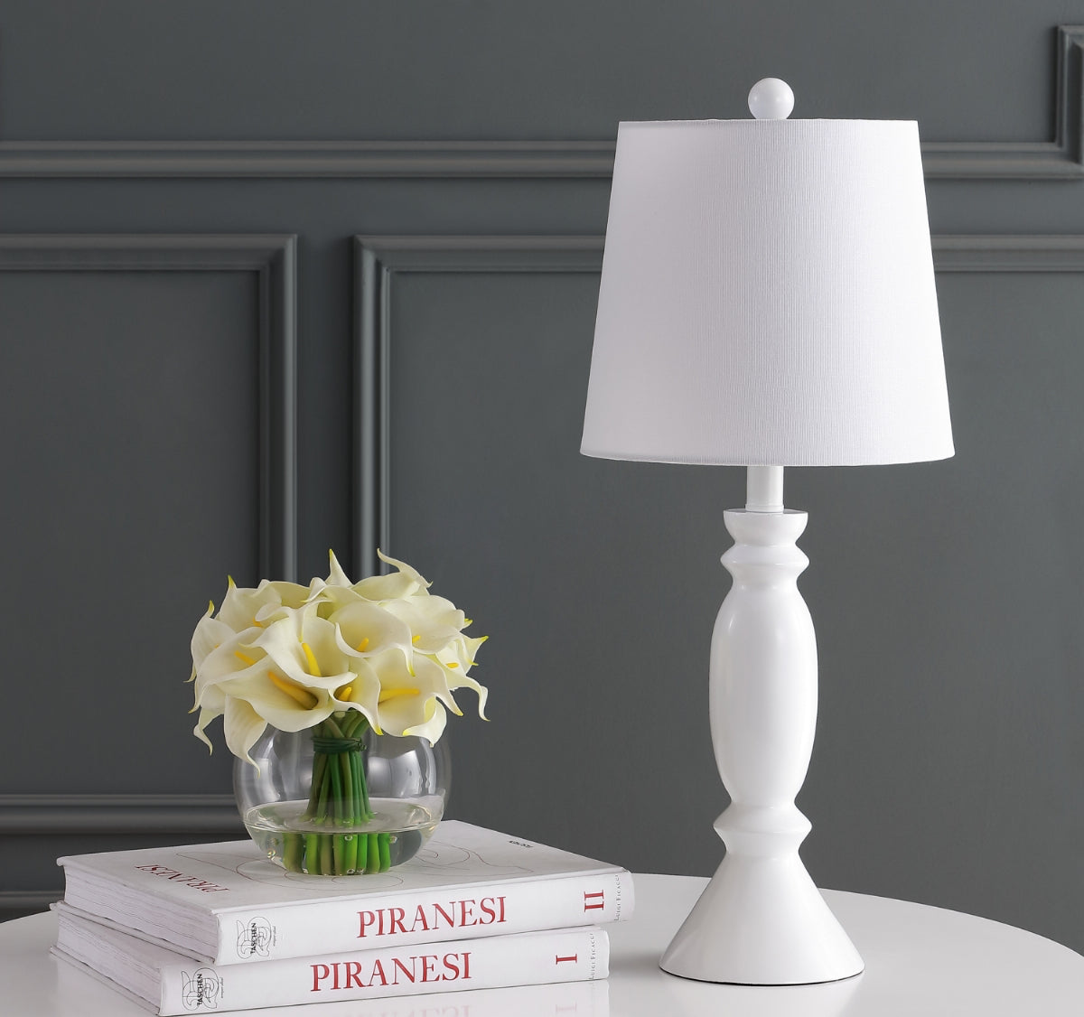 Refresh and renew any living room with this classic table lamp. Designed to blend into any decor, its bright white finish and curvaceous silhouette uplift any room. Its complementary off white 100% cotton shade and finial make it a designer favorite.