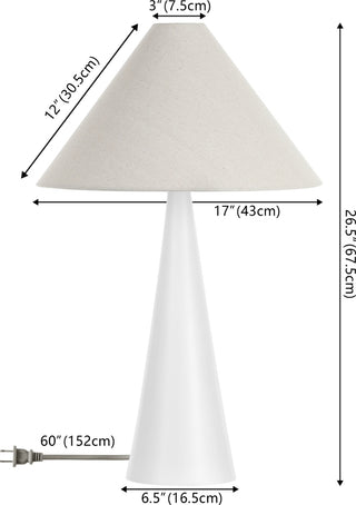 The Kimora Table Lamp stands at an overall height of 26.5 inches, making it ideal for use on end tables, nightstands, or desks. The base diameter measures 6.5 inches, providing stability and a refined footprint. With dimensions of 17 inches in width and 12 inches in height, the lamp shade is perfectly sized to deliver a balanced and functional lighting experience.