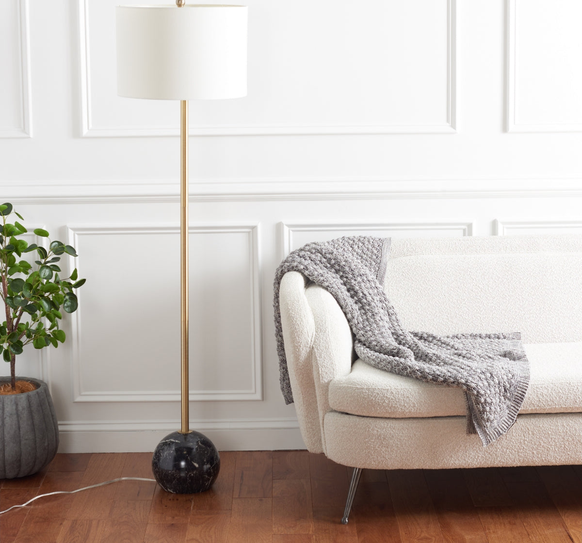 Glamorously modern, this Kyrene Floor Lamp is in a class of its own. Kyrene's spherical black marble base provides the perfect decorative counterpoint to its sleek gold body, while a crisp white drum shade completes the look.