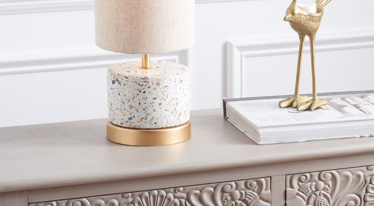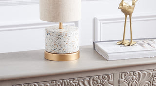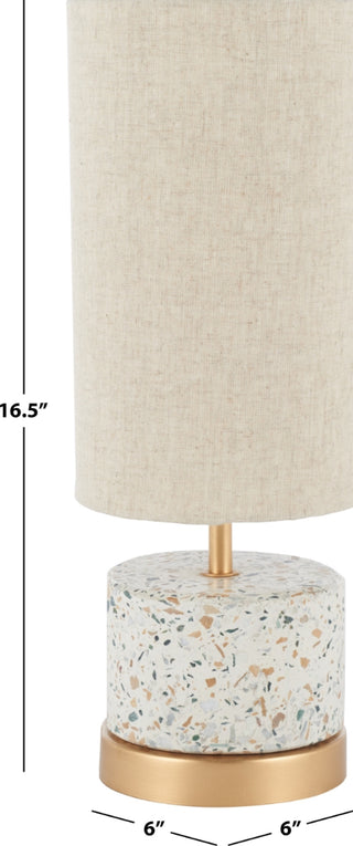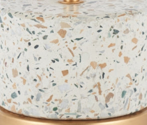Add a playful and charming accent to your home with the Laszlo table lamp. A concrete composite is speckled with stone fragments to enrich the sleek cylindrical body of our table lamp. It features a tall and elegant drum shade to vouch for a delightful play of proportions. Lively and charming, the table lamp is completed with a complementing linen shade and gold accents to add personality and drama to your home.