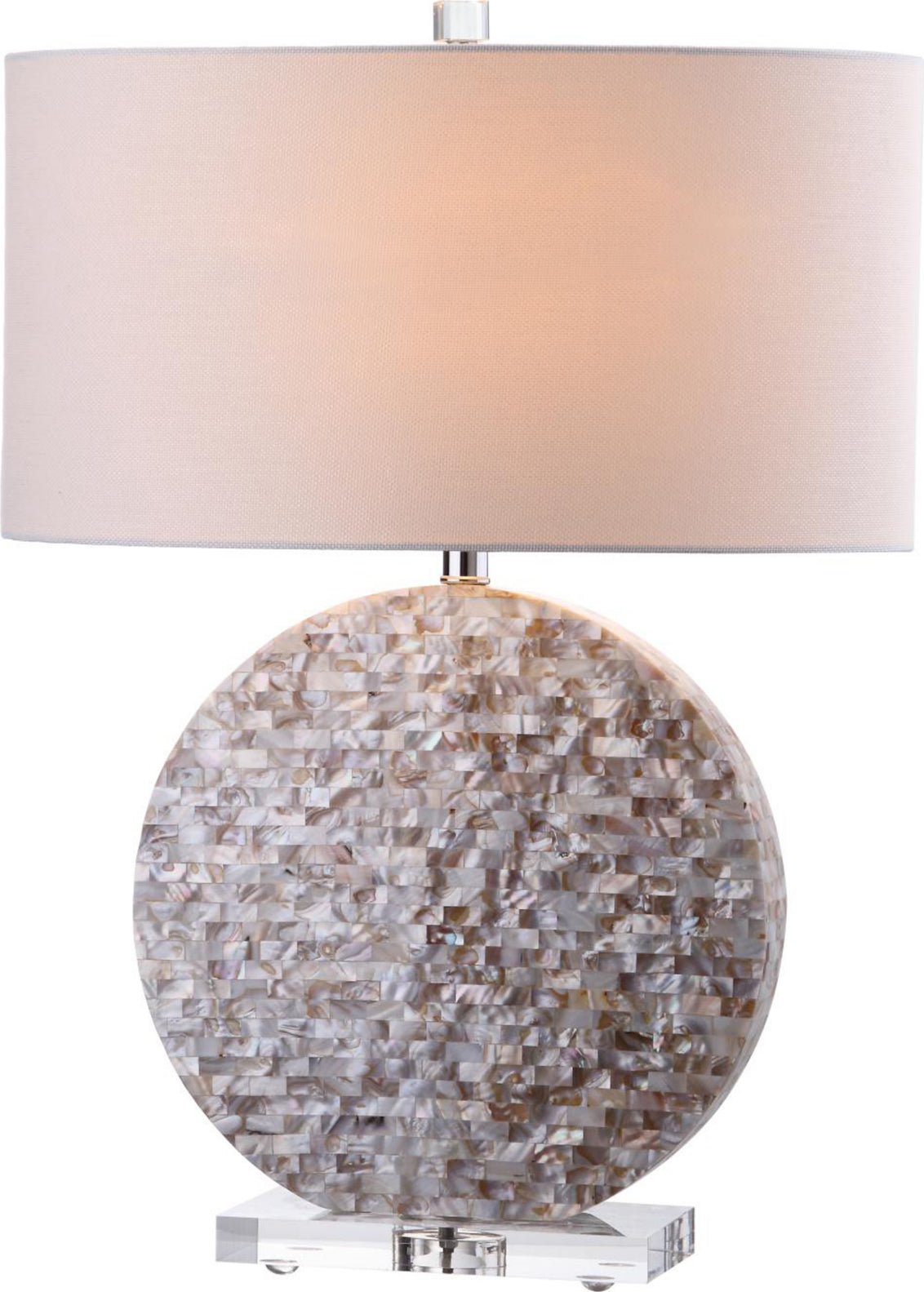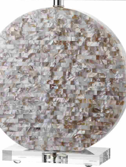 A glimmering round disc encased in a natural shell mosaic forms the striking base of the Lindsey Table Lamp. With white cotton drum shade and an acrylic base and finial, this lamp shines with style in any transitional setting.