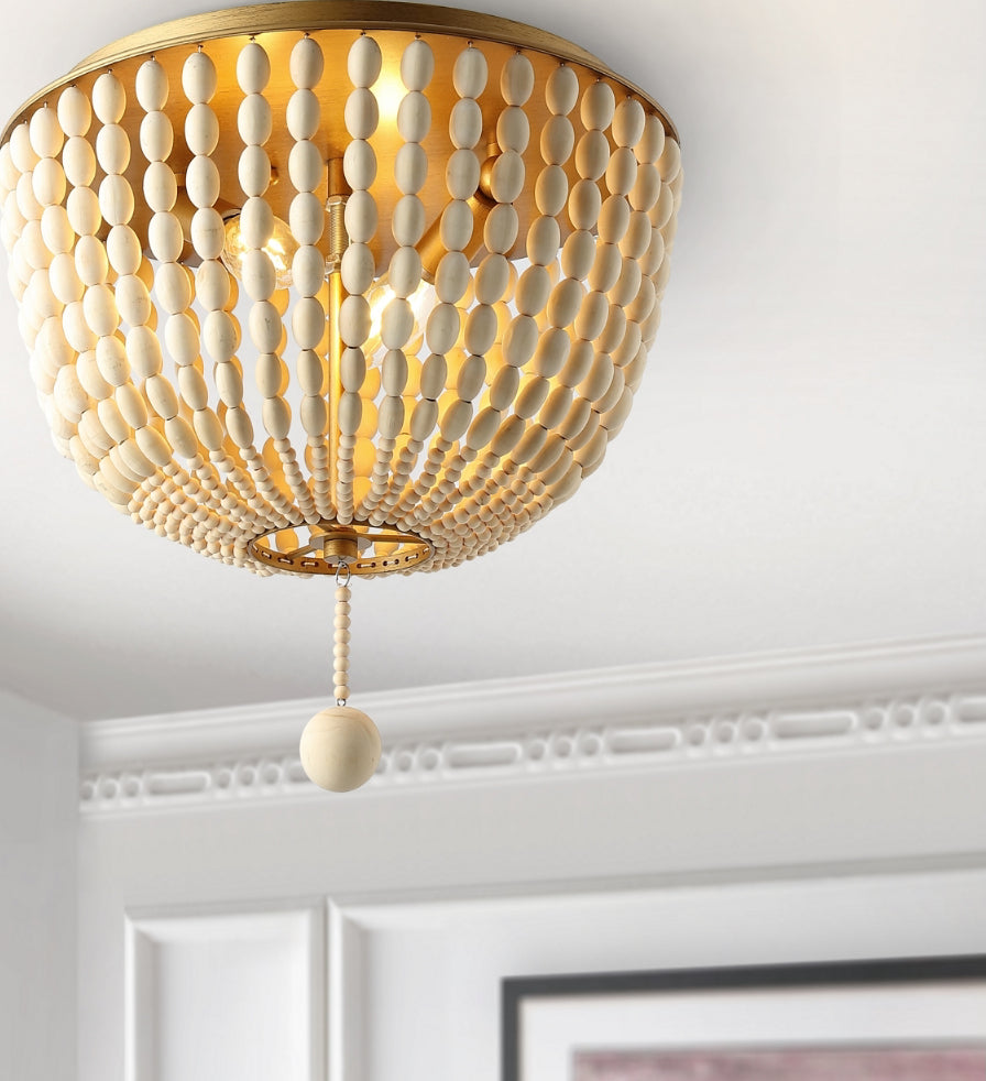 Boho chic meets modern glamour in this eye catching Loris Flush Mount. Strands of cream wooden beads cascade beneath a shining gold base, creating a stunning interplay of light and shadow that enlivens any interior, making Loris a must have for clean-lined furnishings.