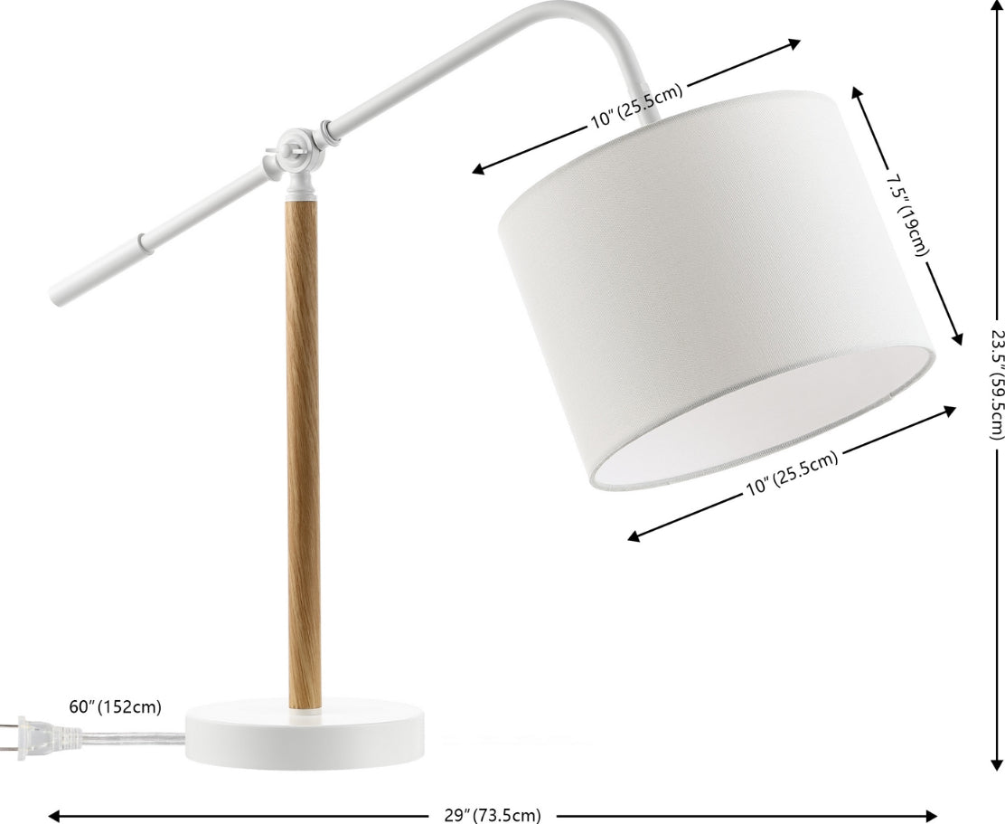 Update any surface with the modern charm and practicality of our Loryn table lamp. With clean lines and a graceful appeal, our table lamp remains a chic and inviting feature for any room. An elegantly curved arm suspends our modern drum shade. An overall white finish and warm wooden accents lend a fresh appeal to the table lamp. Its pivoting arm helps to direct light to your desired area. Our table lamp brightens up a desk, nightstand, or end table with effortless charm.