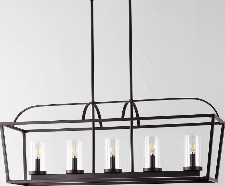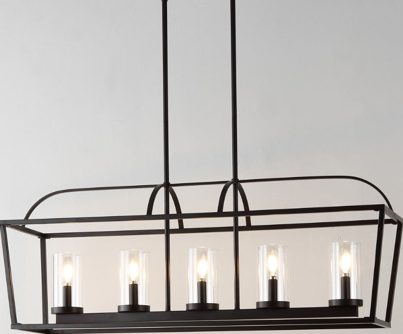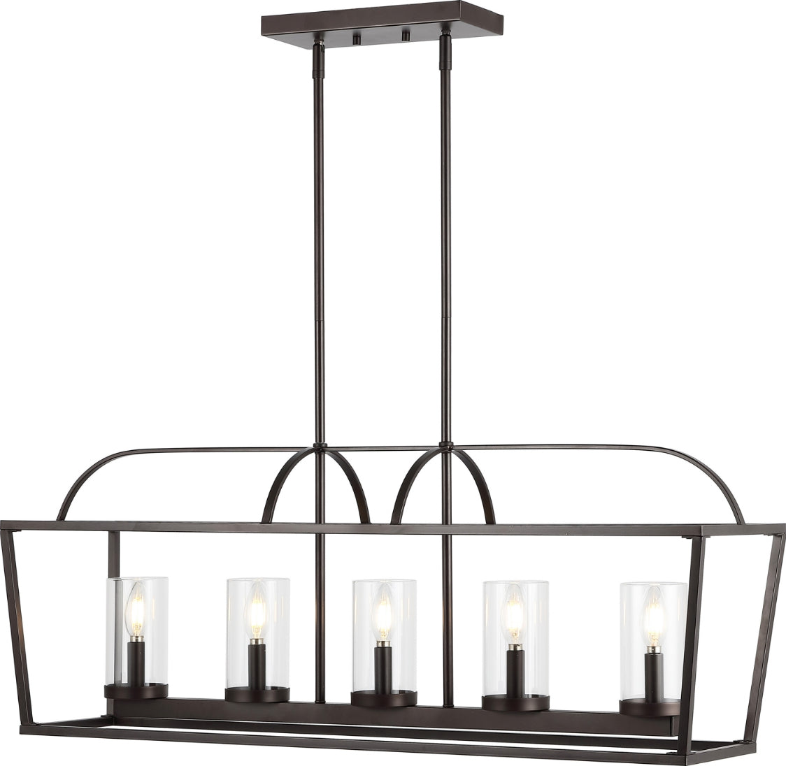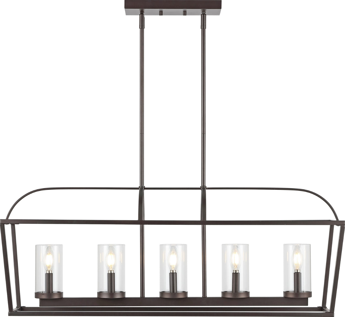 Bring a touch of drama and elegance to your home with our Manning chandelier. Taking inspiration from a classic lantern, our chandelier blends modern and traditional aesthetics with perfect poise. Its open frame, sleek geometric lines and arched top vouch for a graceful and stately presence. It features a robust oil-rubbed bronze finish for added depth and dimension. Our linear chandelier includes five candle-style lights enclosed in cylindrical glass shades, to create warm and pleasant illumination in your kitchen, dining room, or living space.