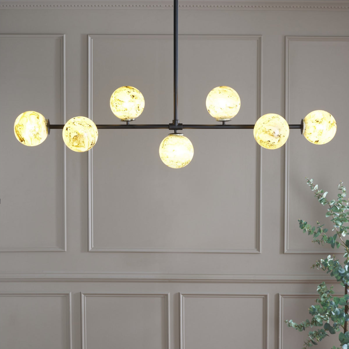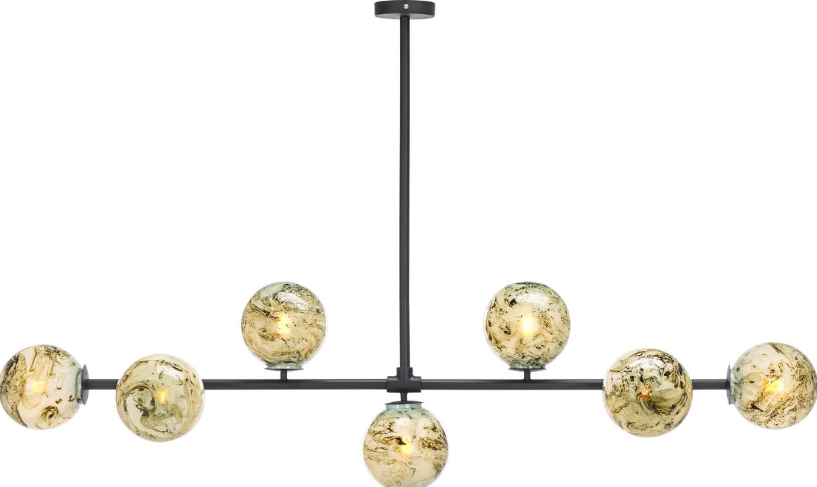 As seen in the image, the MELESA Chandelier features a harmonious array of glass globes, each exhibiting a marbled pattern that brings an artistic element to the fixture. The varying earthy tones within the globes suggest a natural variation, adding depth and interest to the chandelier's overall presentation. It beautifully disperses light, creating a warm atmosphere that enhances the ambiance of a room.