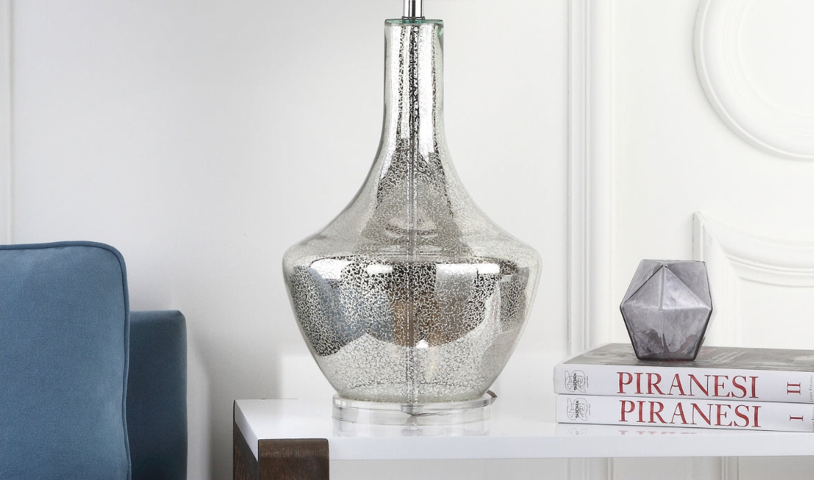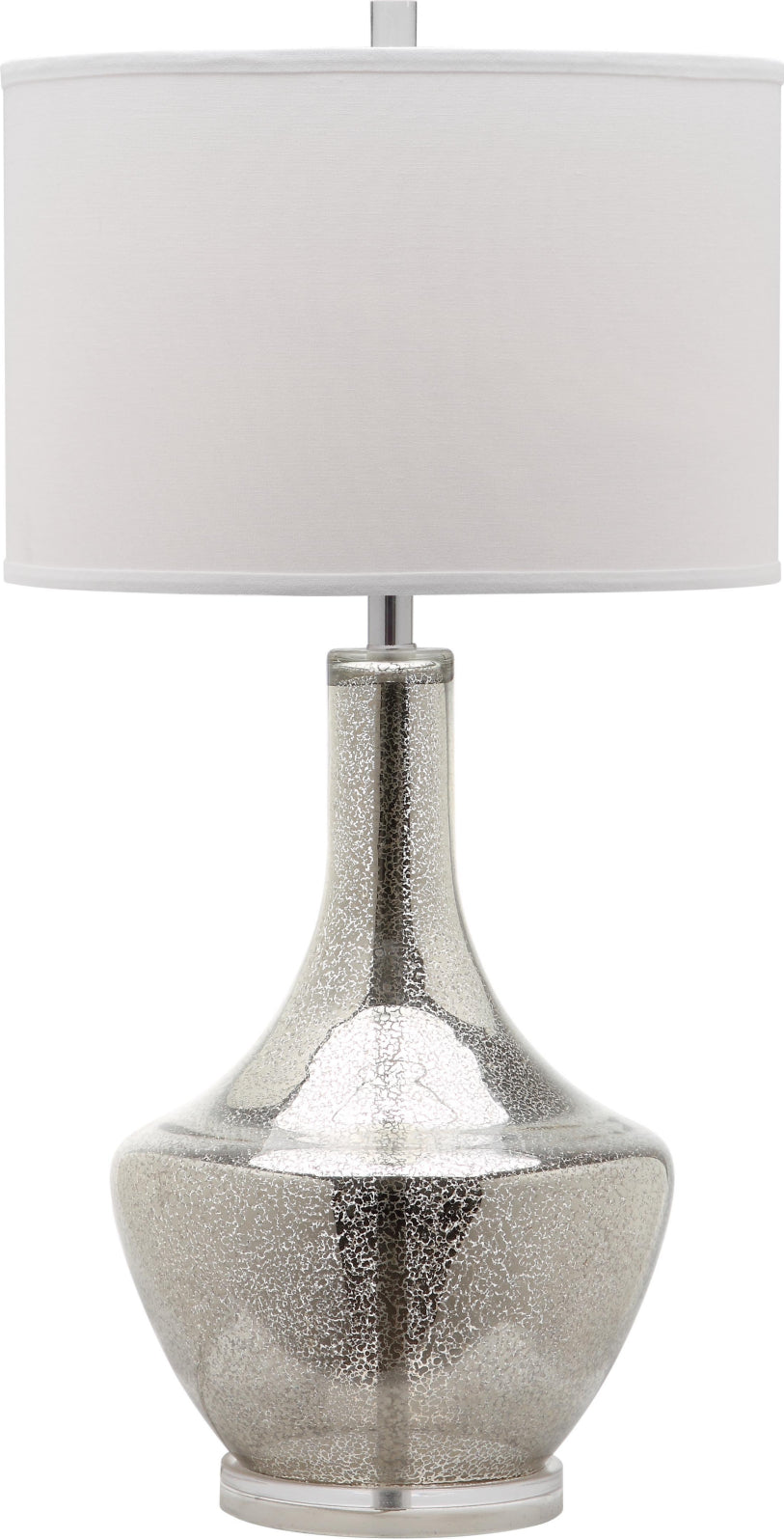 Cast a romantic glow in your living room or bedroom with the silver Mercury Table Lamp. Inspired by vintage mercury glass, the crackled urn shaped base is contrasted by a white cotton drum shade.