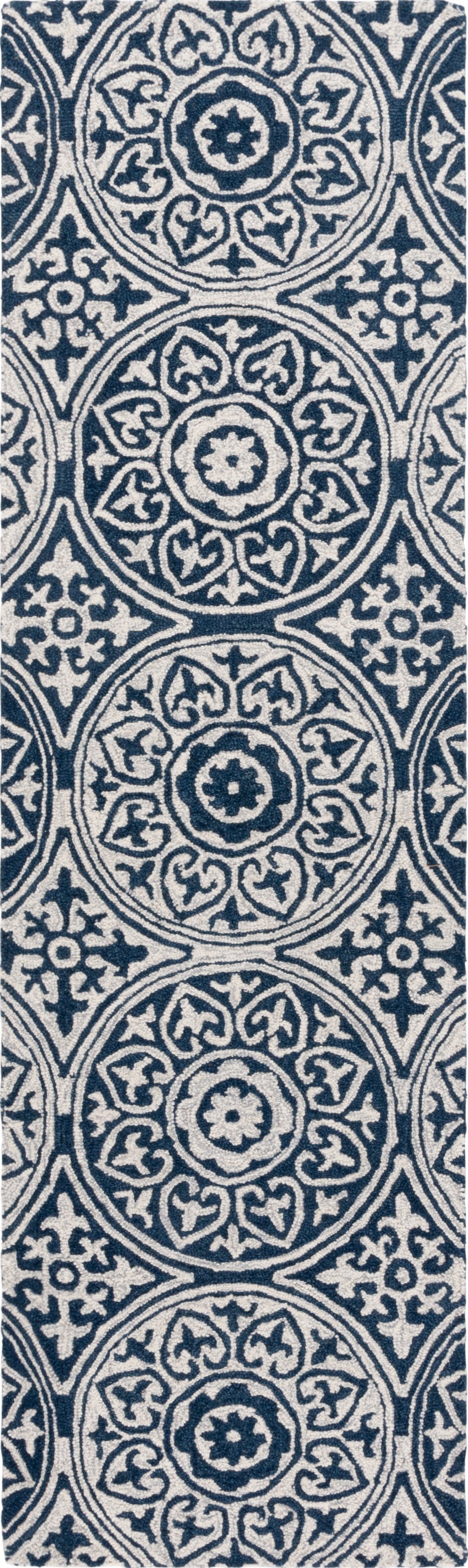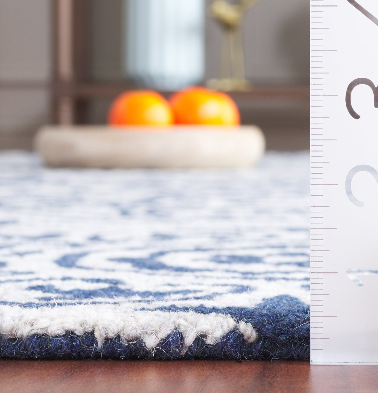 Elevate your home with this exquisite hand-tufted runner rug, featuring a mesmerizing blend of blue and ivory hues. Crafted in India, this elegant piece measures 2'-3'' X 8' and boasts a plush pile height of 1/2'' for ultimate comfort underfoot.
