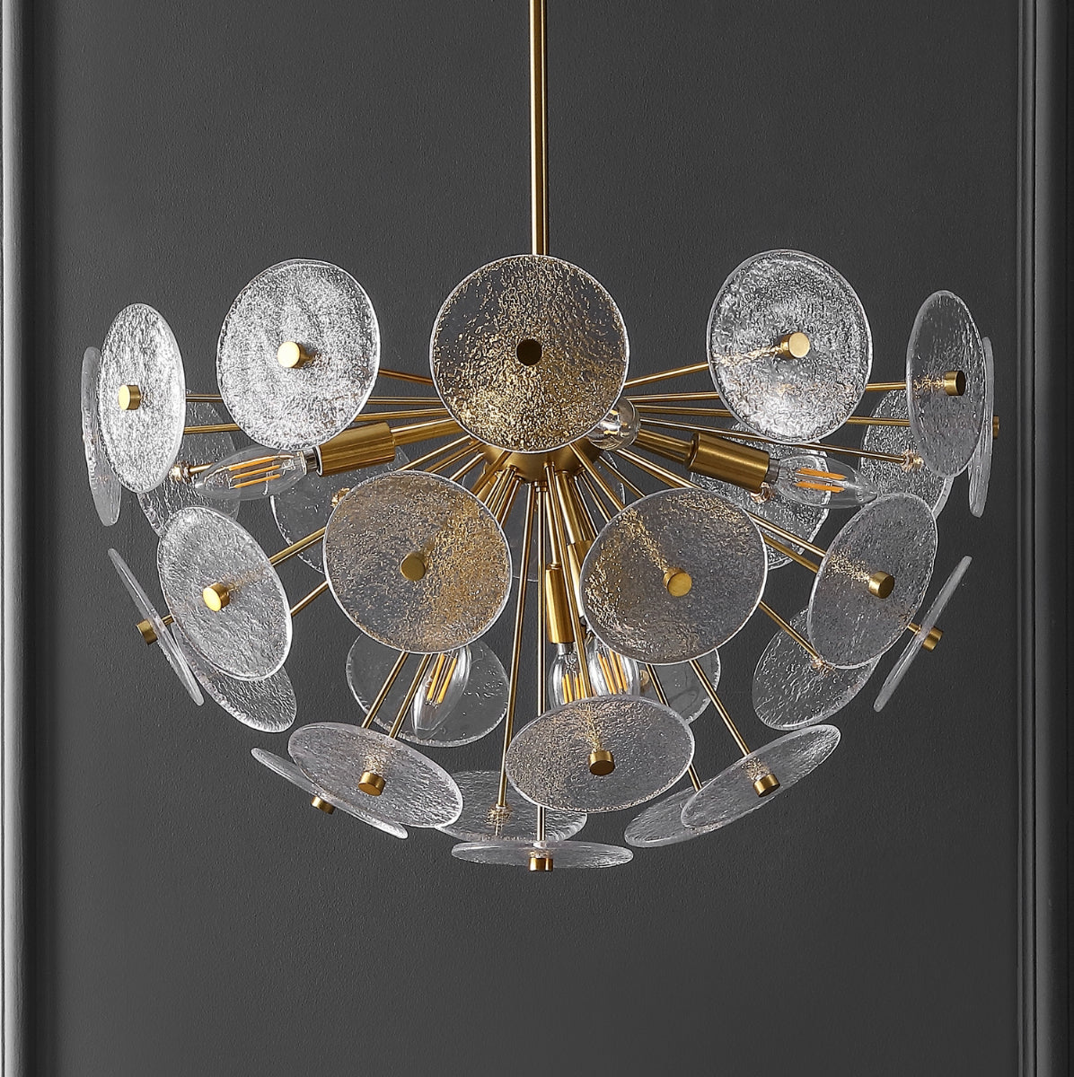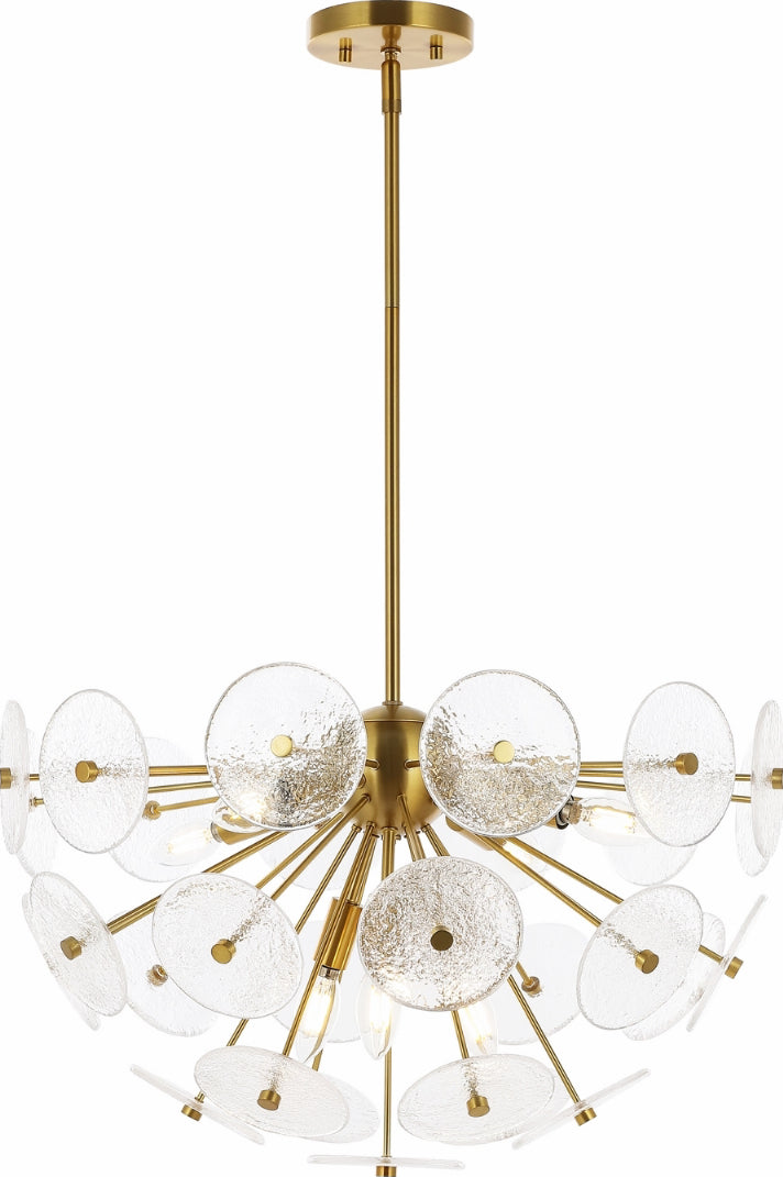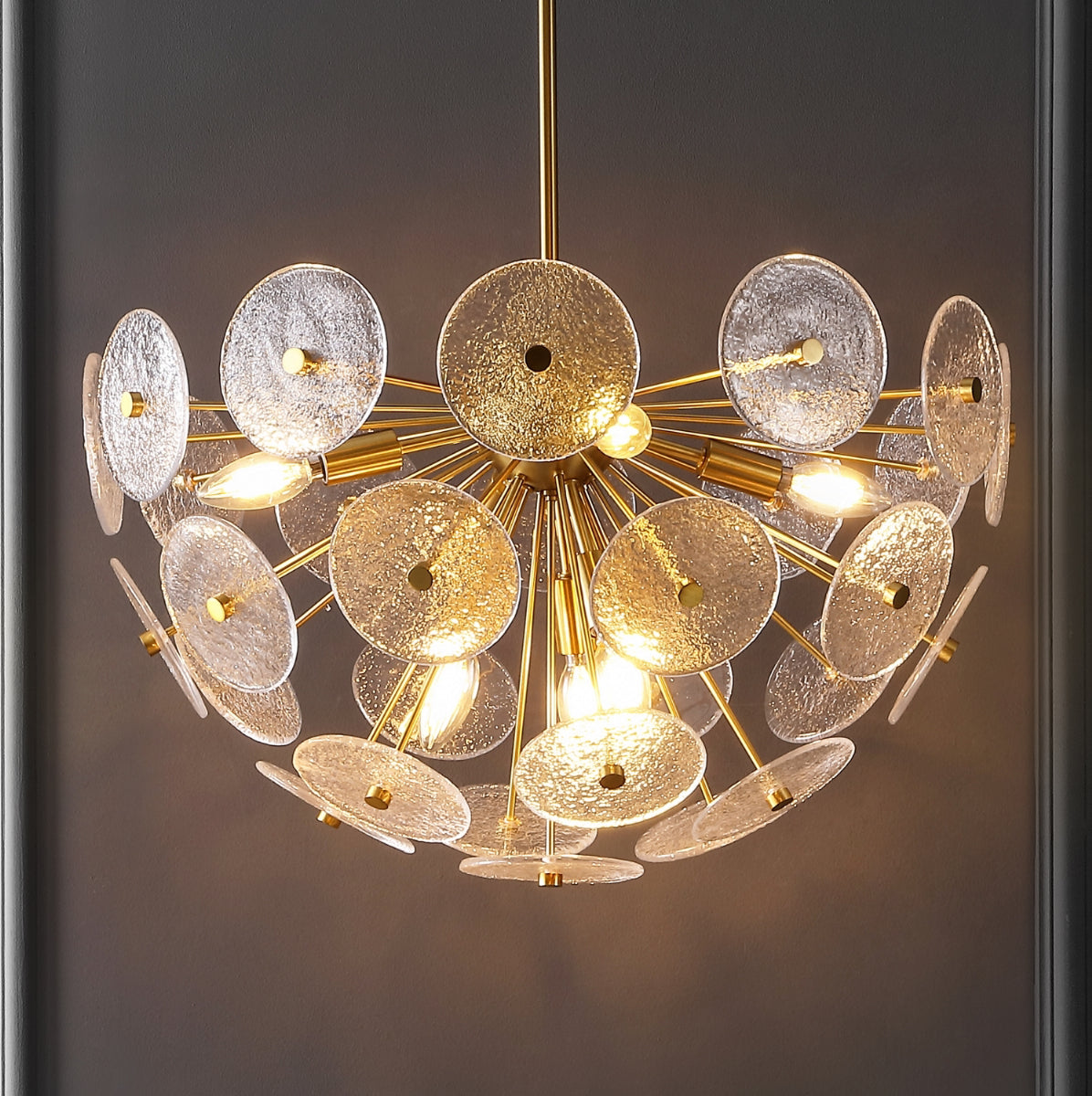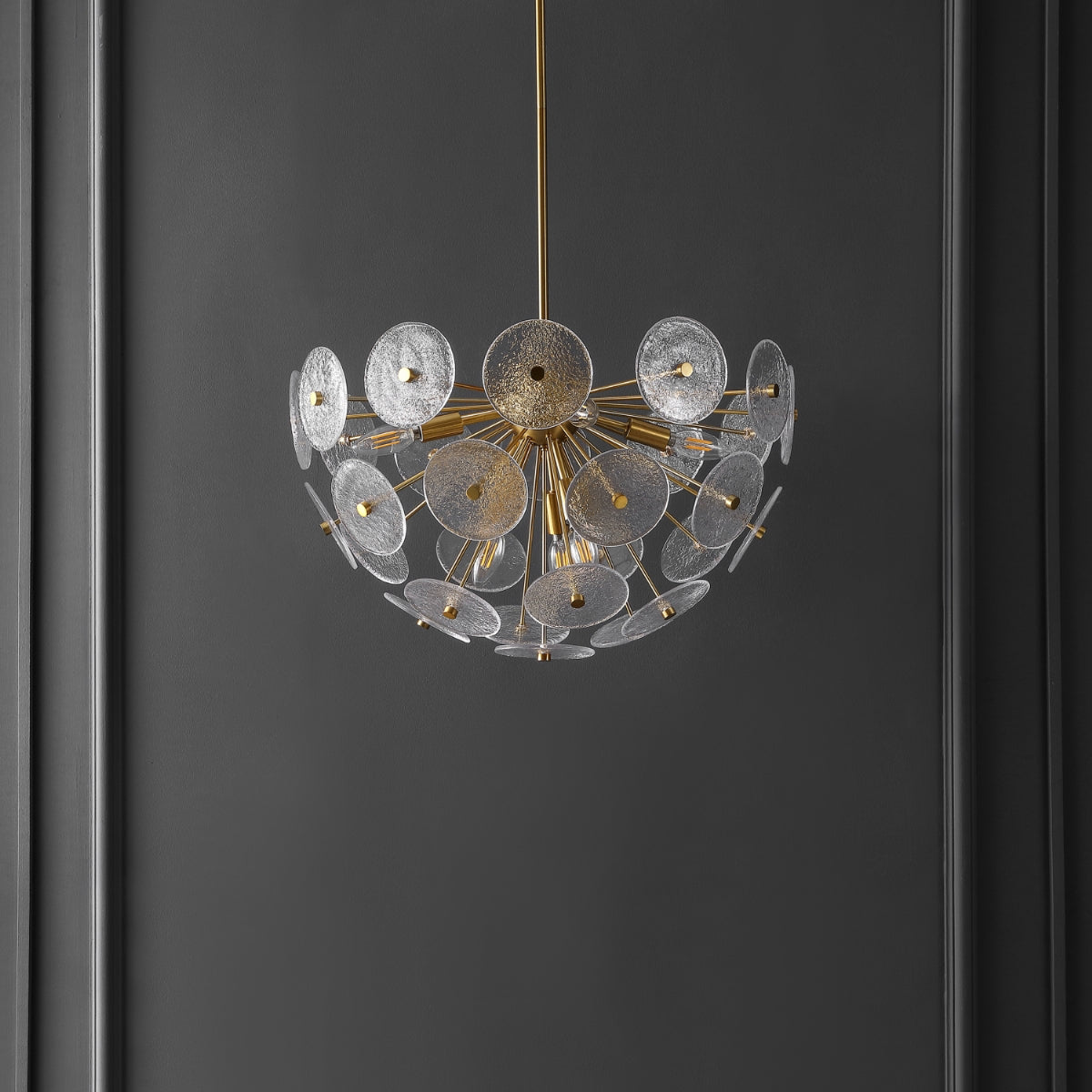 Brighten up your home with the grandeur and elegance of our Miri extendable pendant. A beautiful cluster of glass discs accumulates in a voluminous sphere to deliver an eye-catching and ultra-modern ceiling light. It elegantly mixes clear glass and brass accents to bring a sophisticated touch of luxury to any room. The compact design of our pendant includes 6 lights to filter a soft and pleasant glow, serving as a radiant and stylish centerpiece for your entryway, dining room, living area, or kitchen.