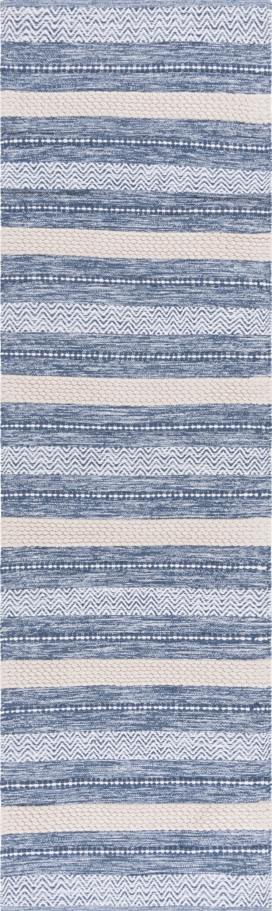 Introducing our luxurious 2'3'' X 8' runner area rug, meticulously crafted in India using superior handloom techniques. This elegant rug, drenched in rich navy and embellished with ivory accents, gives a nod to timeless sophistication. Constructed with premium-quality cotton, it boasts a lush 3/8'' pile height, offering plush comfort underfoot. Experience the harmonious blend of tradition and trend with this exquisite runner rug, the ideal addition to your hallway or any elongated space needing a stylish touch!