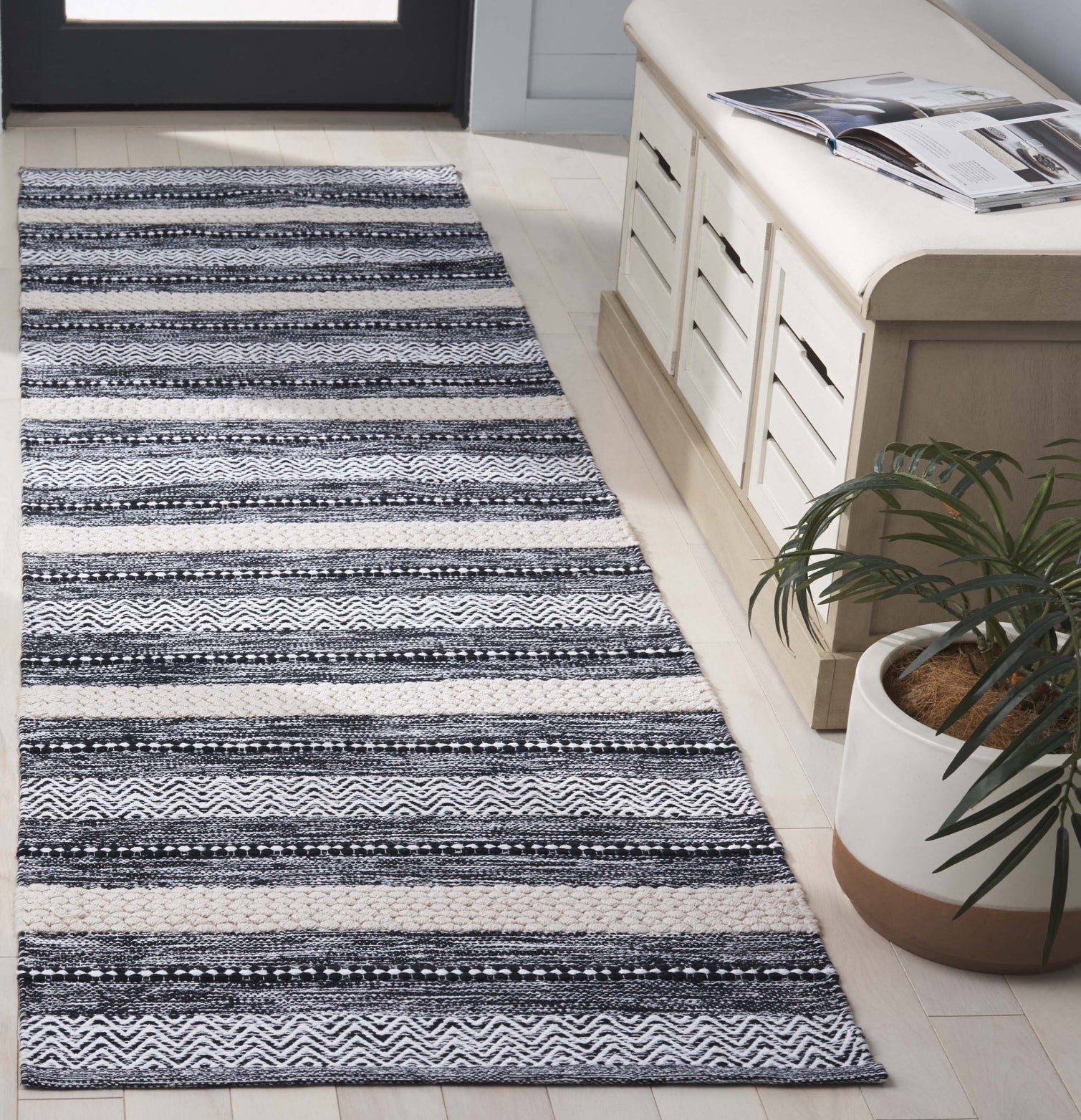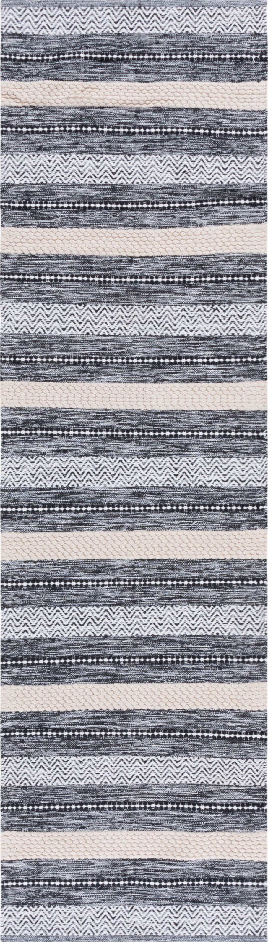 Experience the elegance, sophistication and high standard directly from the heart of India with our Black/Ivory 2'-3'' X 8' Runner Area Rug. Handcrafted using time-honored Handloom technique, this runner is a testament to the rich artistic heritage, woven carefully by skilled artisans to ensure the highest quality finish.