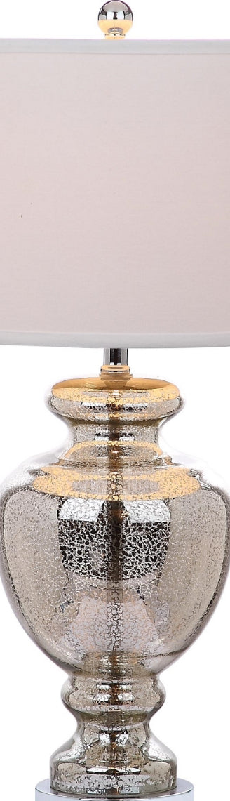 Inspired by collectible colored glass vases and bottles, the clear mercury glass table lamp is a perfect accessory for coastal and cottage style interiors. Silver fittings and off white cotton hardback drum shade update the romantic vintage look.