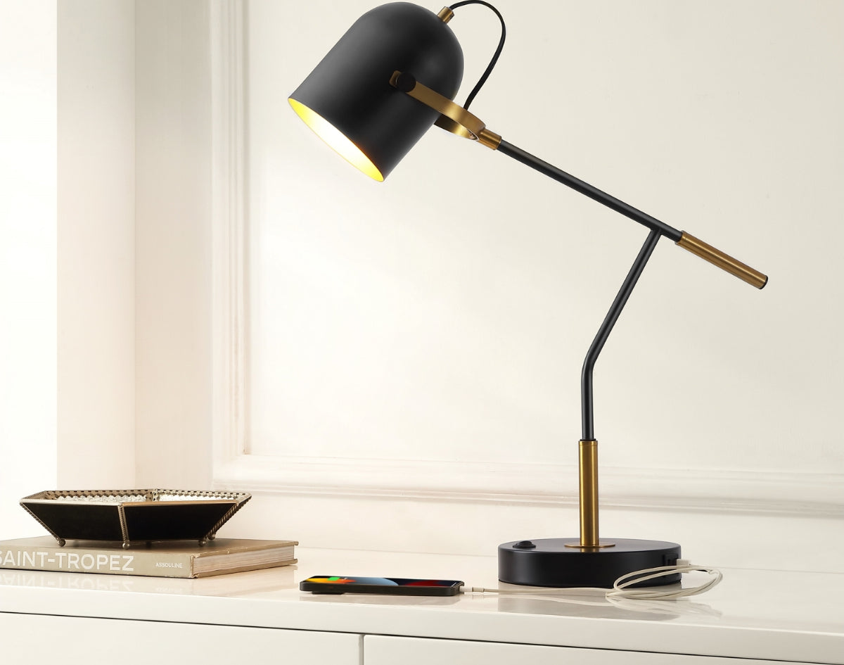 Bring elevated style and functionality to your workspace with our Mulaney table lamp. Featuring functional details and a stunning mix of finishes, the lamp adds sleek style and practical appeal to any tabletop. It features a pivoted arm and adjustable shade to focus light just where you need it. Its sleek black metallic body is contrasted with gleaming brass hardware to add a polished and refined touch to any tabletop. A built-in USB port adds a functional touch to our desk lamp, making it perfect for a home office, study, or reading nook.