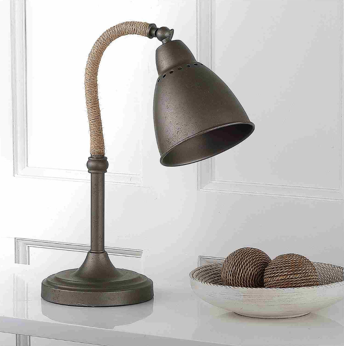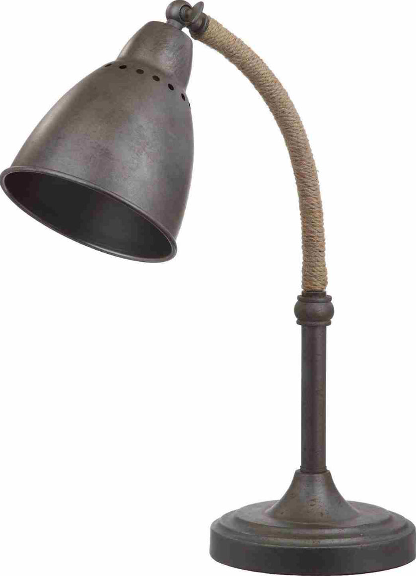 Add instant character to your living room or home office with this modern 19.5 inch table lamp. This updated version of the traditional pharmacy lamp was designed with a dark grey metal finish and rustic rope detail for vintage industrial chic style.